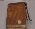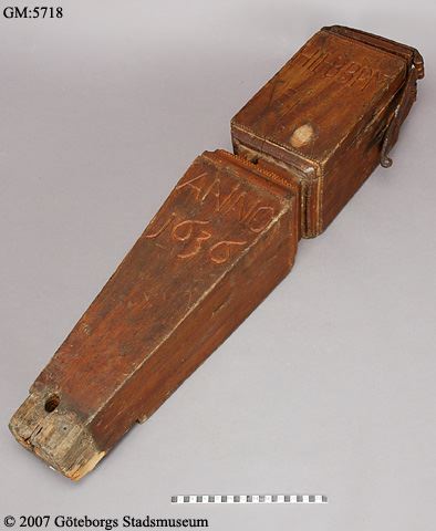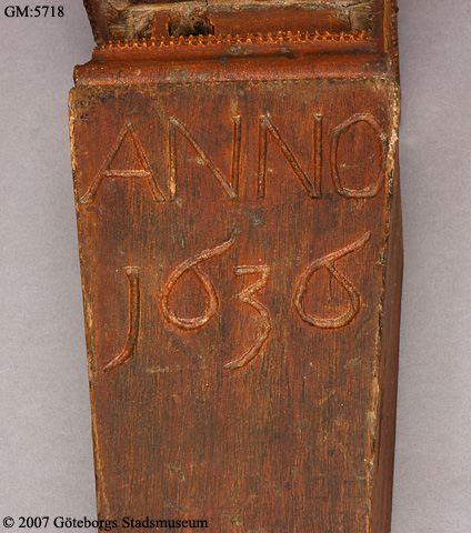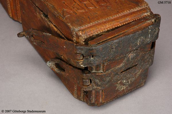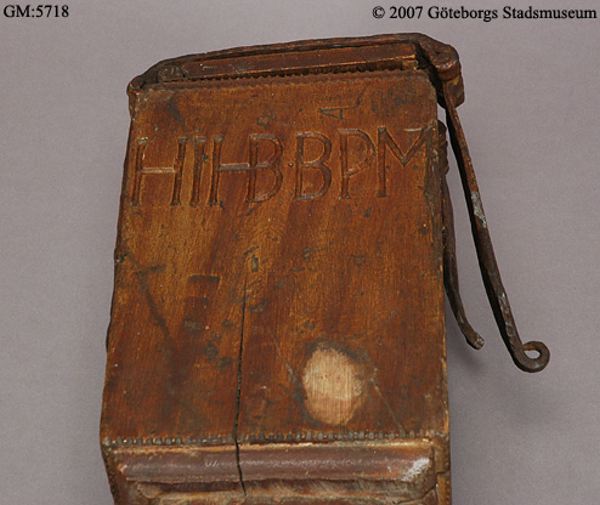 Fattigbössa dat. 1636 av rödmålad ek och fur. Med järnbeslag och järnhaspar över locket. Insatt i ny fot. ornerade lister. På framsidan är inskuret HIHB BPM ANNO 1636. Från okänd kyrka. År 1910 överlämnad som gåva av kronofogde J.A. Ringius sterbhus. Lagerberg i Göteborg. museets årsttryck 1911.s.37. (--enligt uppgift från en kyrka å Hisingen.) [enligt katalogkort]