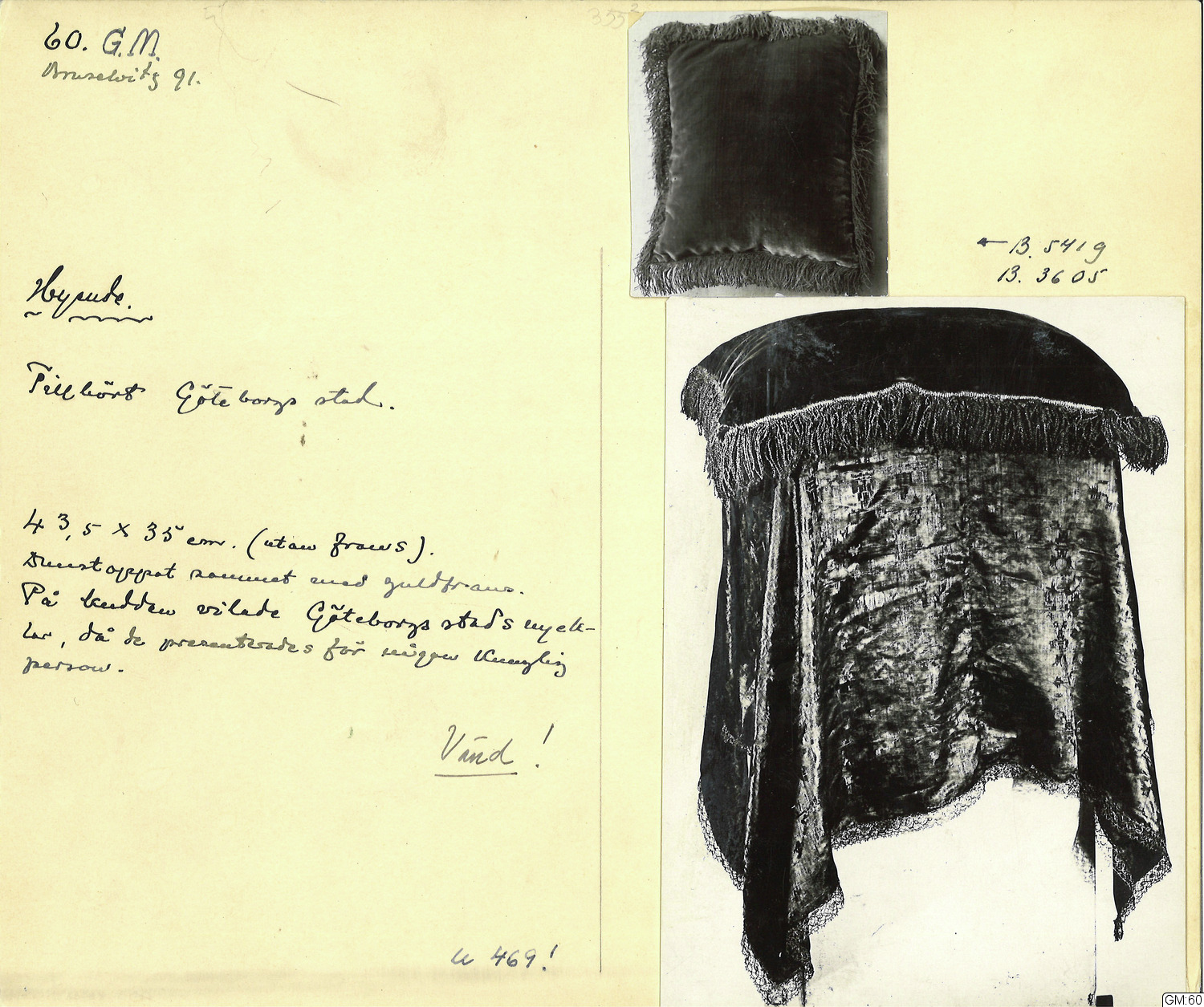 Hyende, dvs kudde, där mursleven GM:58 och hammaren GM:59 som användes av Oscar I 1844 när han lade grundstenen till Börsbyggnaden i Göteborg. Hyendet har användes normalt vid presentation av stadens ...