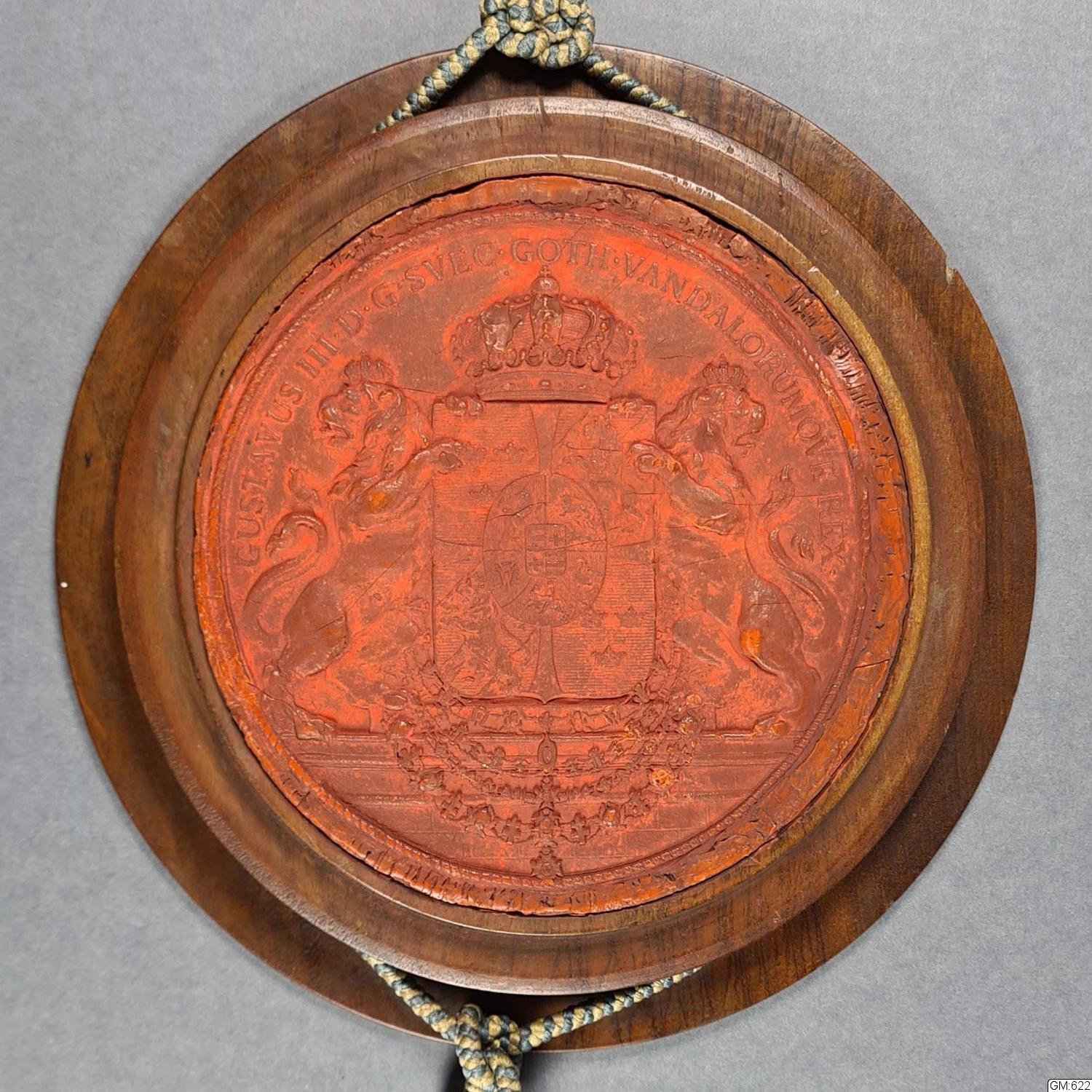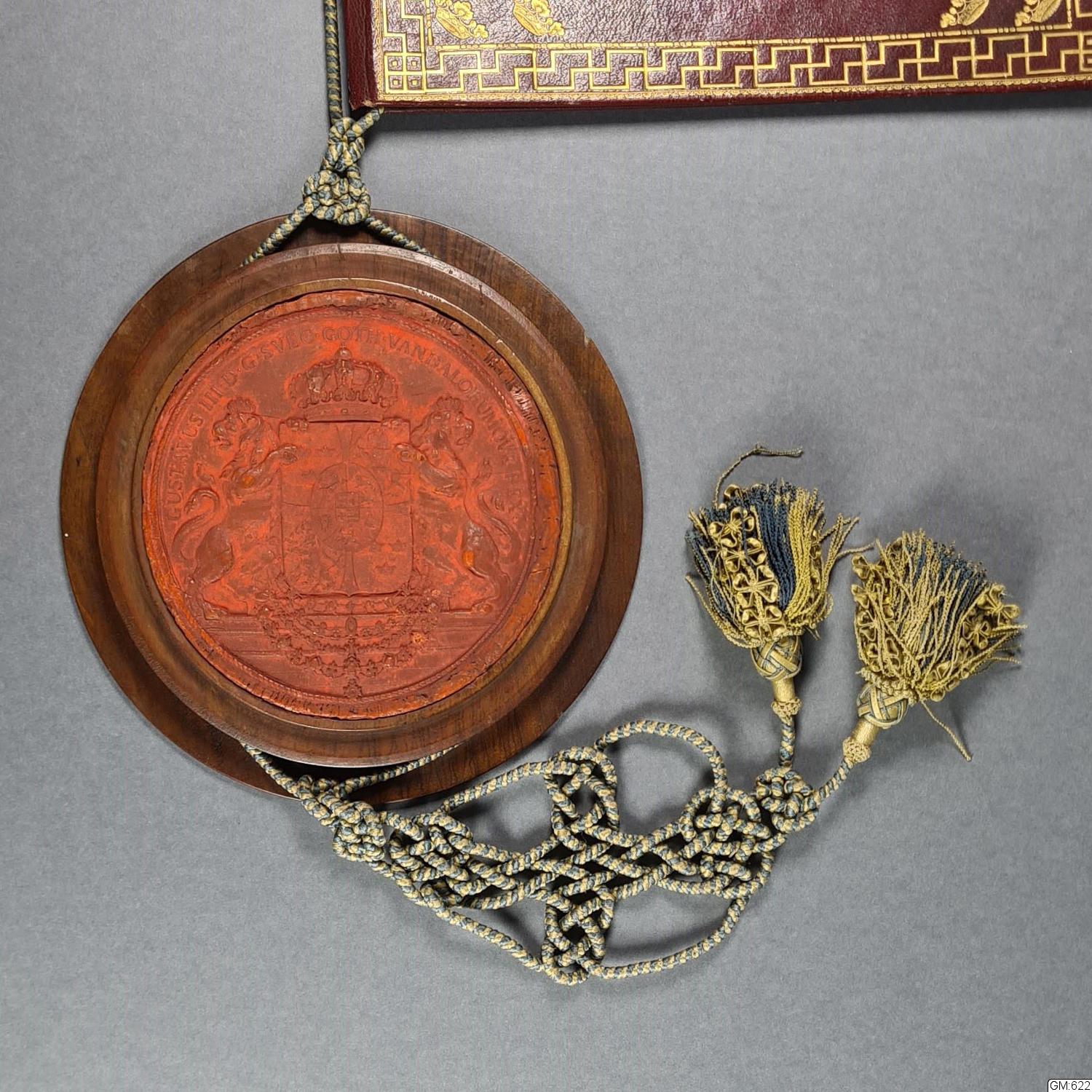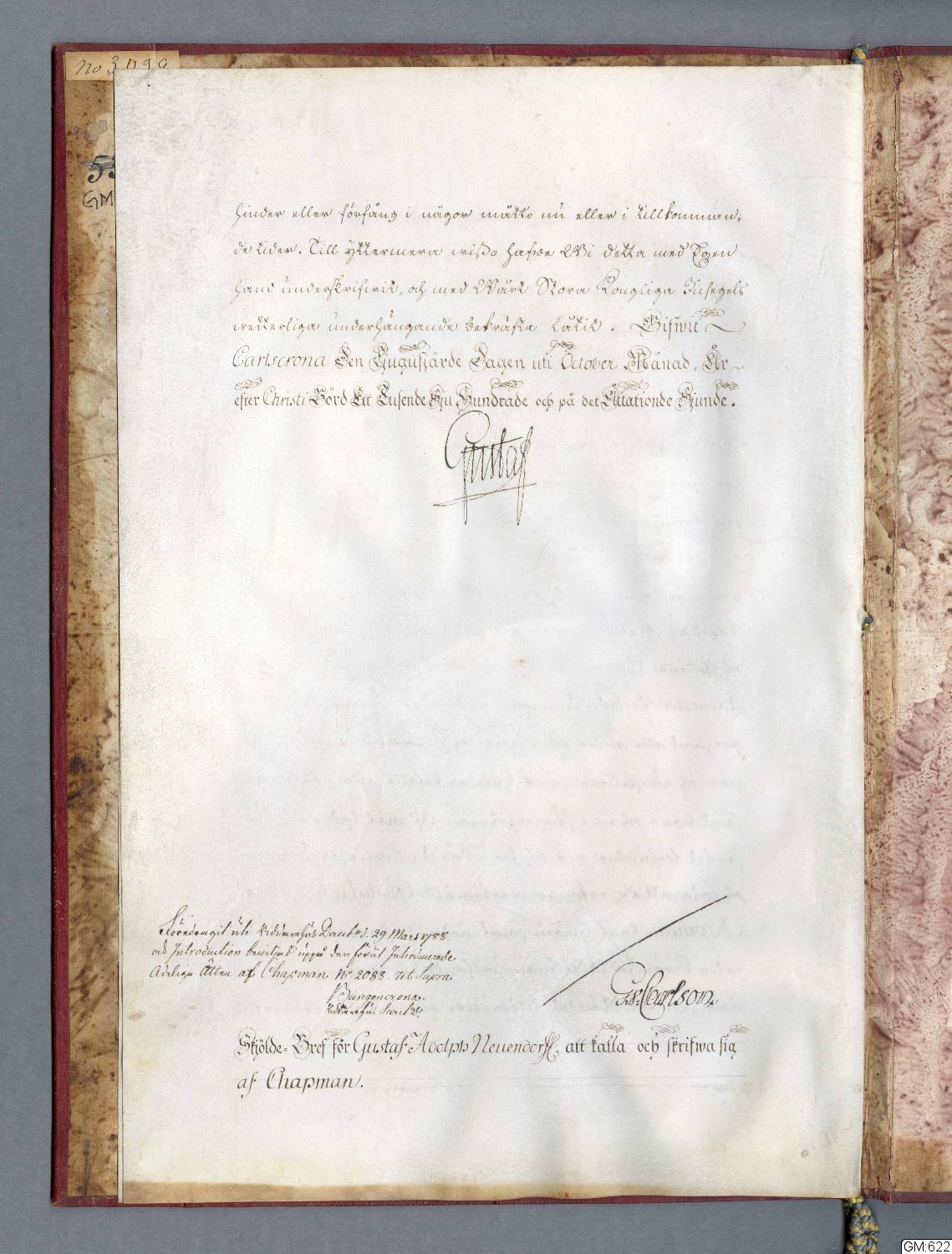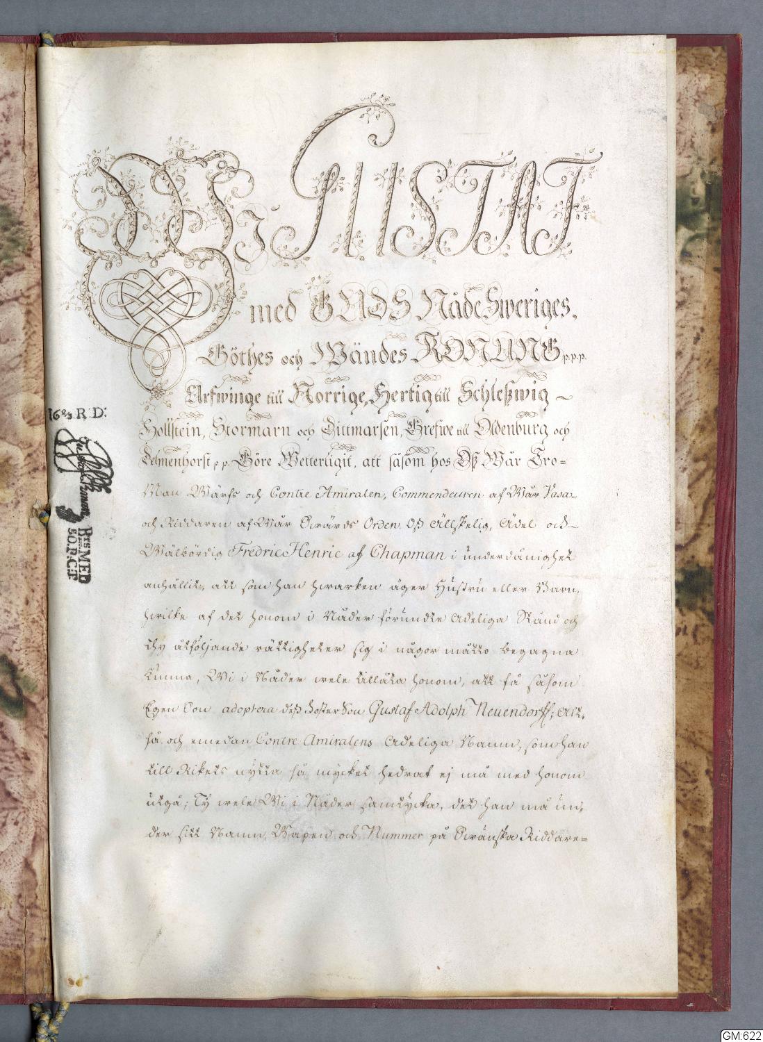 Vapenbrev för Gustav Adolf af Chapman, född Neuendorf. Adoptivson till Fredrik Henric af Chapman, som fick ta över faders familjenamn, "att kalla och förskriva sig som af Chapman" Brevet om 4 sidor inbundet brunt läder, med vidhängade rött sigill.