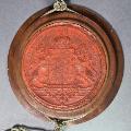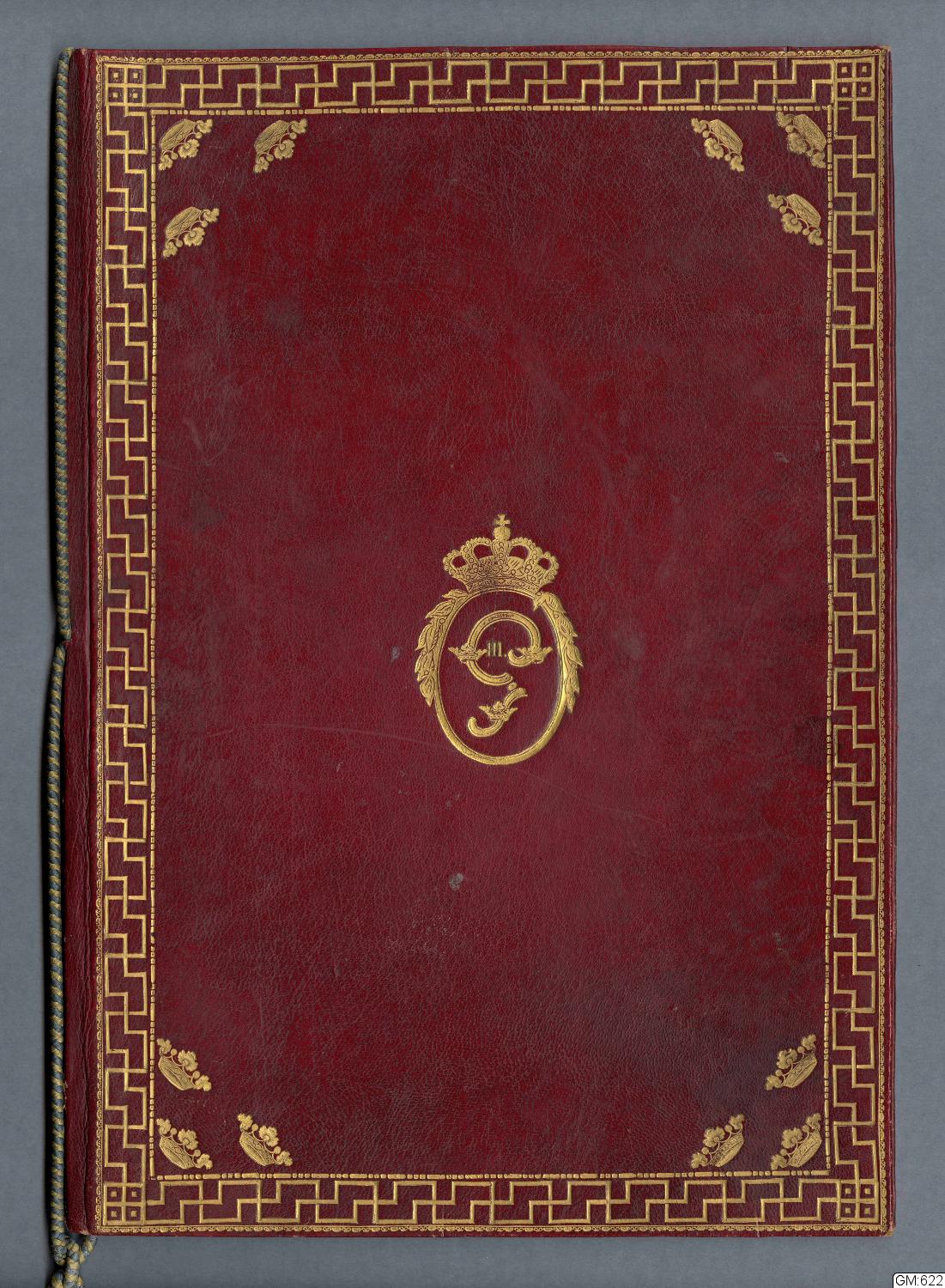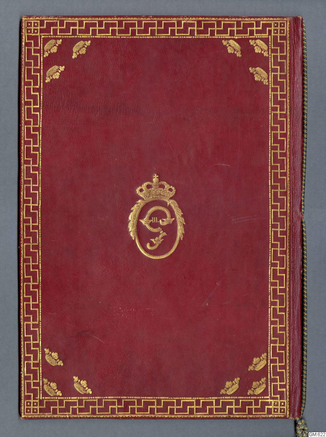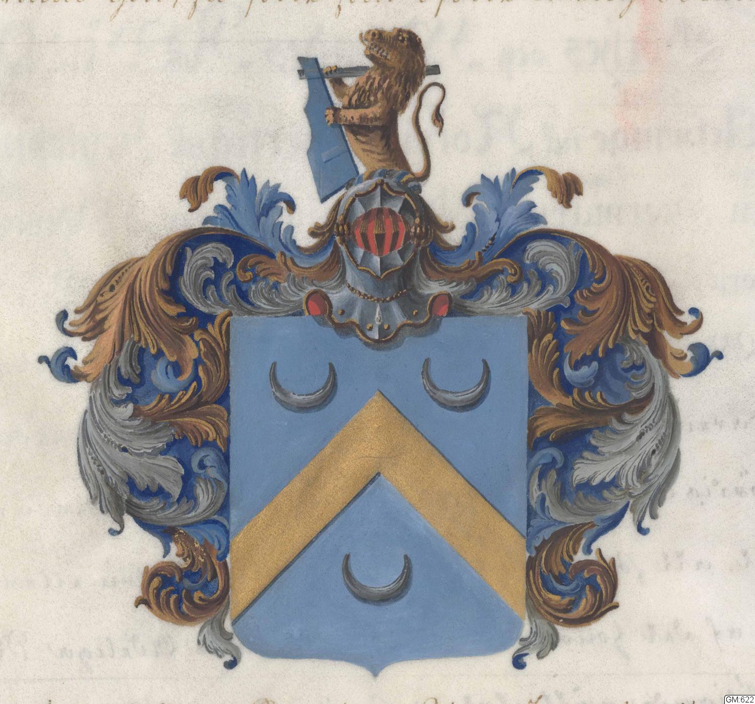 Vapenbrev för Gustav Adolf af Chapman, född Neuendorf. Adoptivson till Fredrik Henric af Chapman, som fick ta över faders familjenamn, "att kalla och förskriva sig som af Chapman" Brevet om 4 sidor inbundet brunt läder, med vidhängade rött sigill.