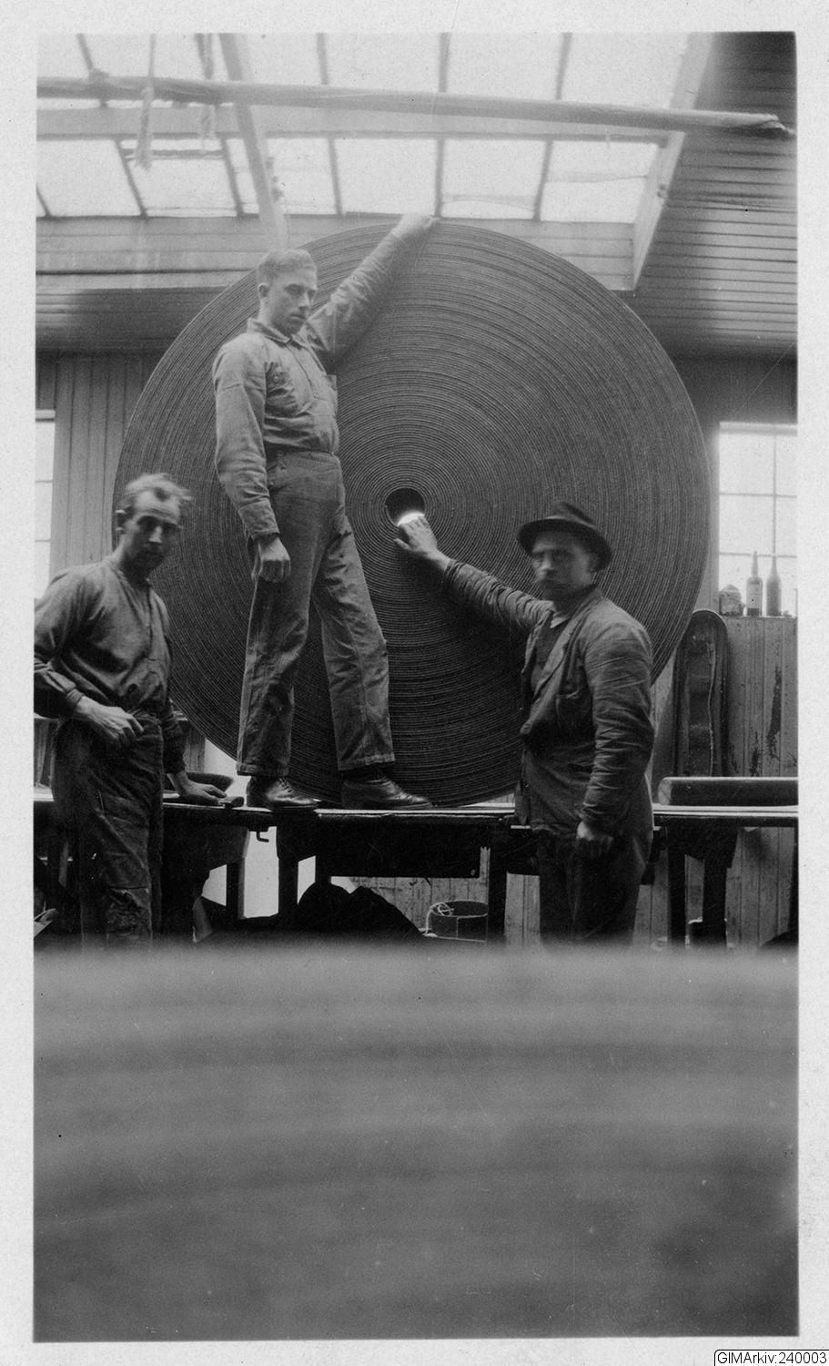 • Interiör Göteborgs Remfabrik med förman Svante Johansson till höger och två okända medarbetare,