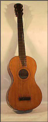 • Gitarr i rödbrun lack, tillverkad av Lorents Mollenberg i Stockholm år 1816. På gripbrädet 12 band av mässing, på locket fem av ebenholz. Skruvarna är av ovanlig form; huvudet är gjort av ljusgult trä; i detta är fästad en gängad järntapp, omkring vilken två mässingsrullar, den ena underifrån den andra ovanifrån är löst insatta i skurvlådan.Genom en ringmutter av mässing som uppirfrån skruvas på j... Visa hela