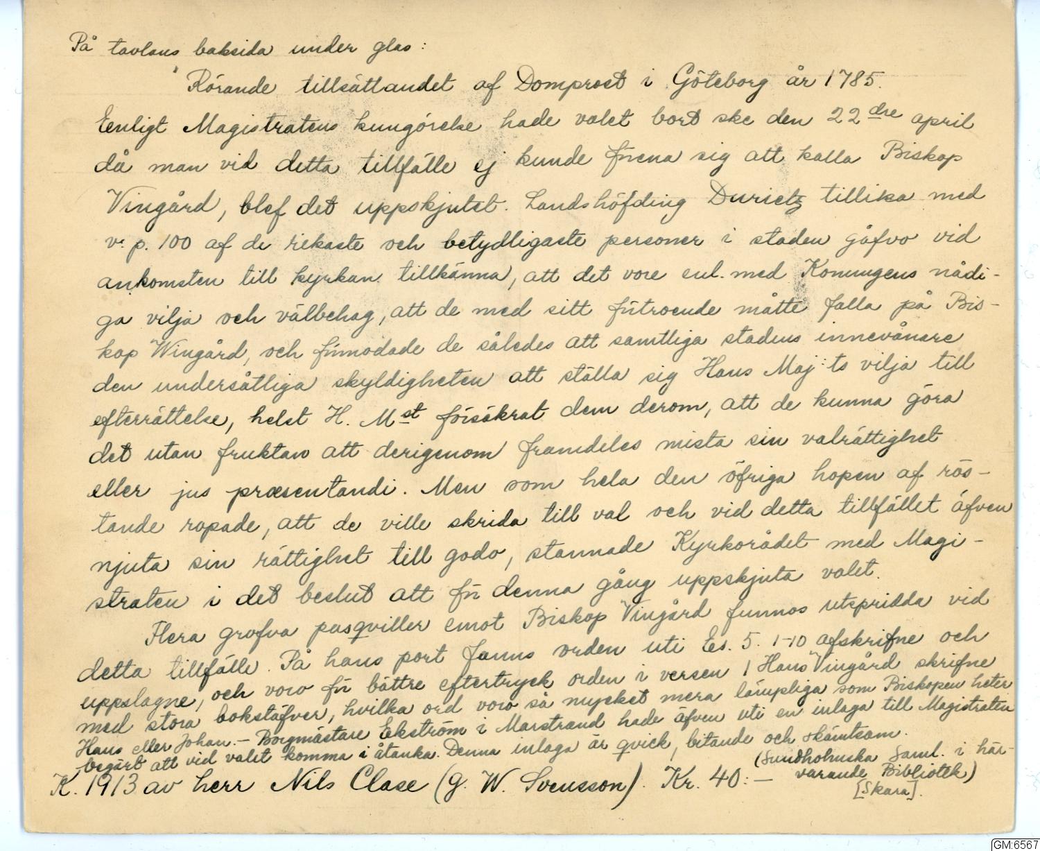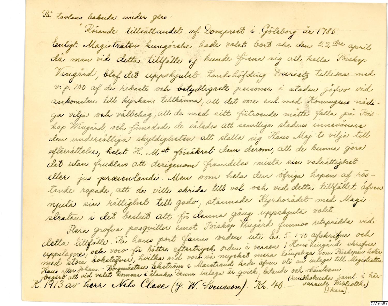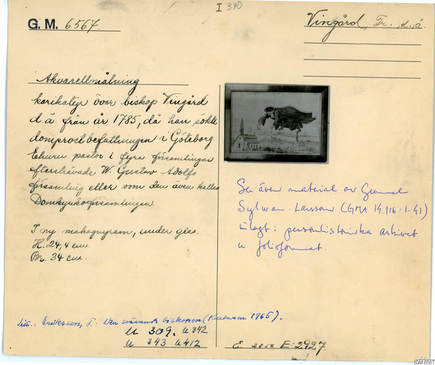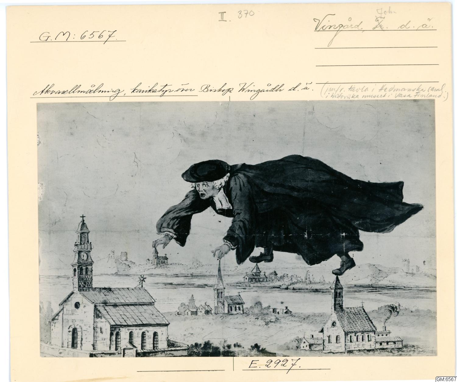 karikatyr Föreställande biskop Wingård i Göteborg flygande över sitt stift, 1785. GM:6567