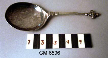 Silver spoons from the 1600s. On some of them, coates of arms and initials indicate which silversmith made them and who owned them. (GM:6596, GM:13340, GMallm:70:a, GMallm:40:b, GMallm:1223:b) [The Bi...