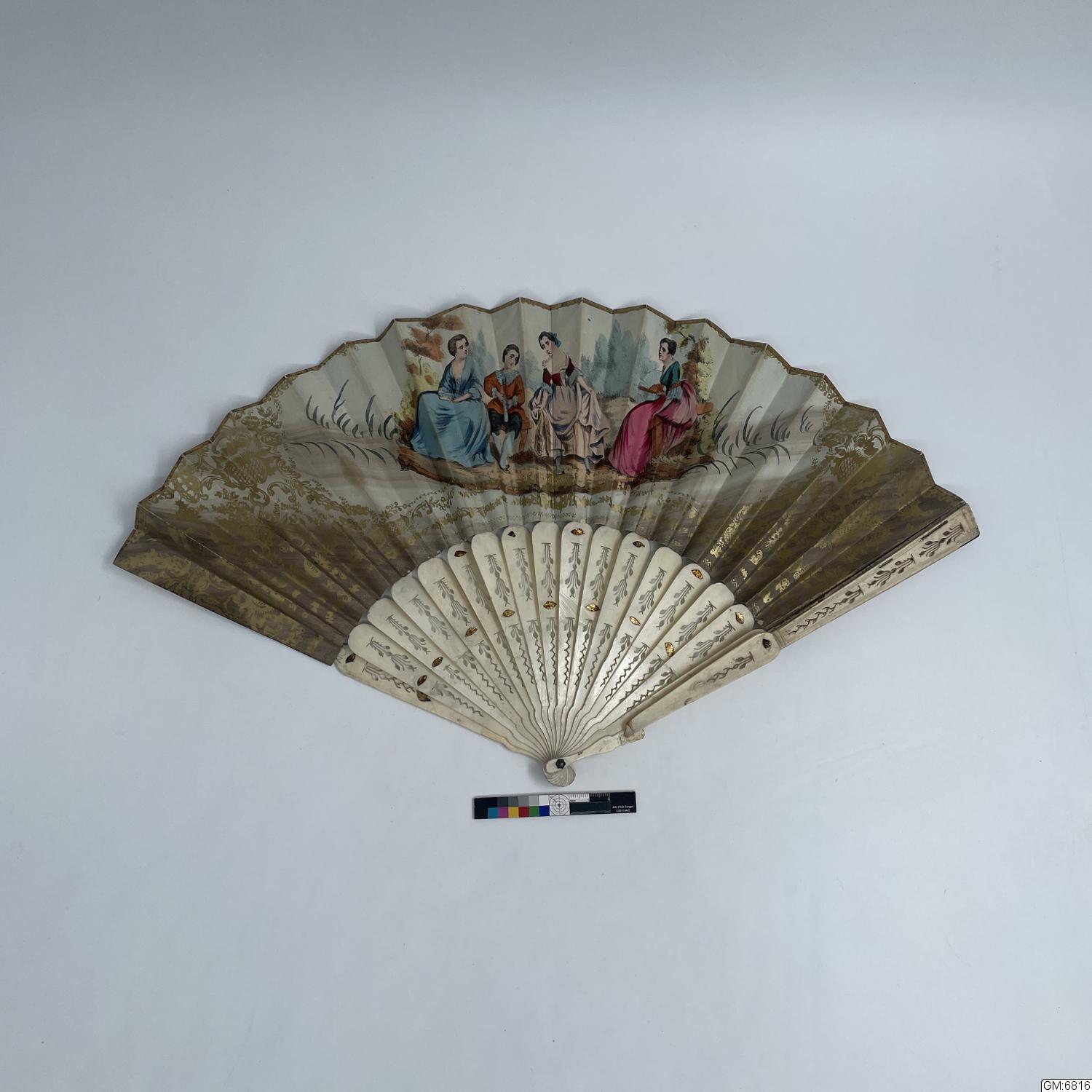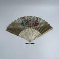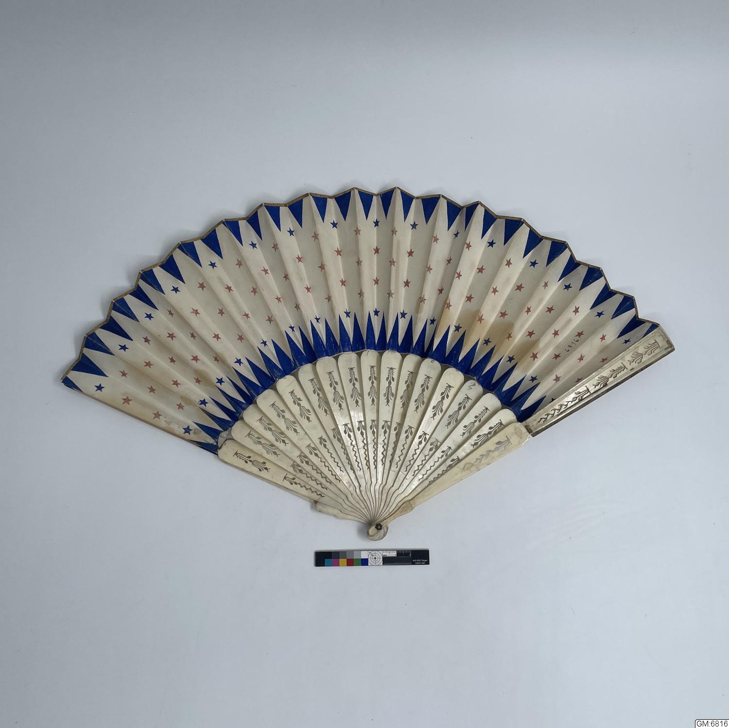 Veckad solfjäder med spröt av ben och överdrag av papper. Överdraget är bemålat på både fram- och baksidan, på ena sidan heltäckande och figurativt och på andra sidan stjärnor och trianglar.