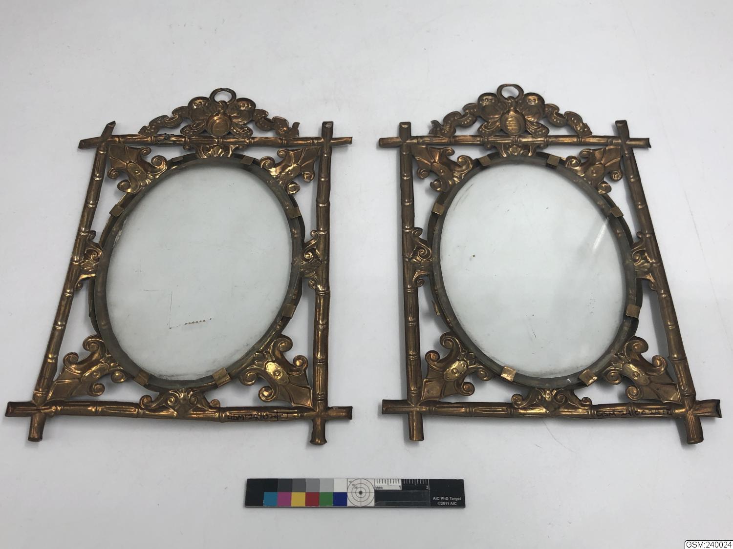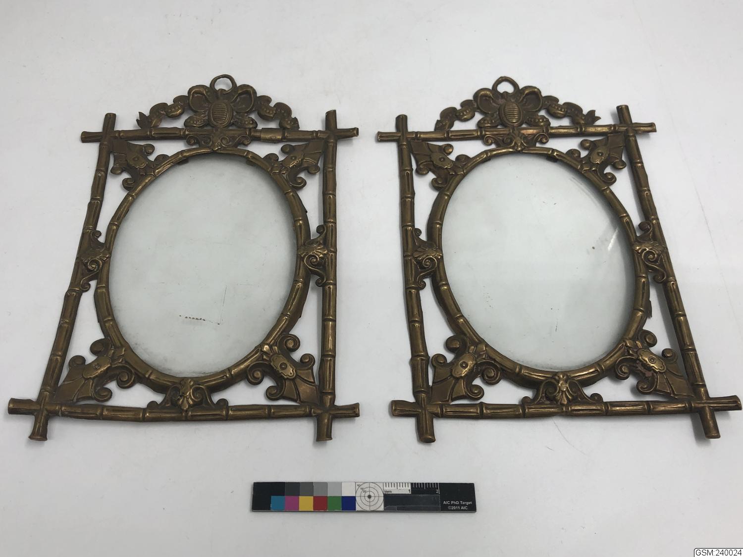 • Två stycken identiska ramar, guldfärgad präglad mässing med rosetter och bambu
