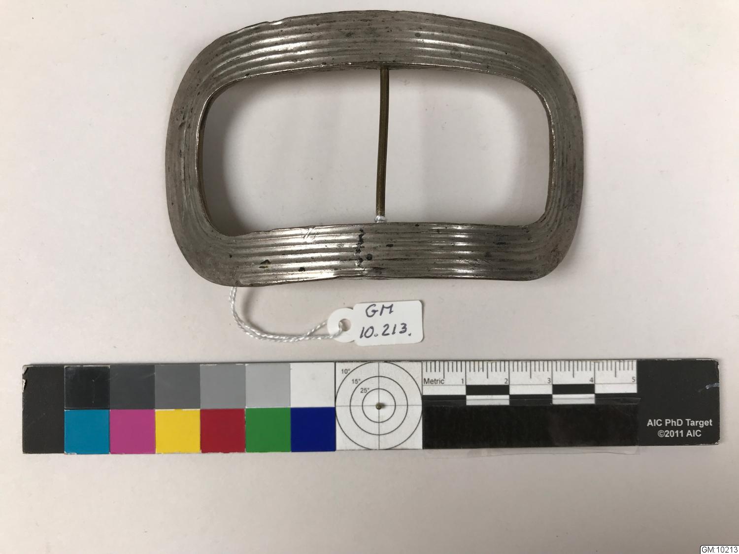 • ett stycken skospänne av mässing och silver. Inte försilvrat utan ett lager silverplåt fäst på en grundkärna av mässing. en rektangulär form med avrundade hörn, dekorerad med inpressade spår.