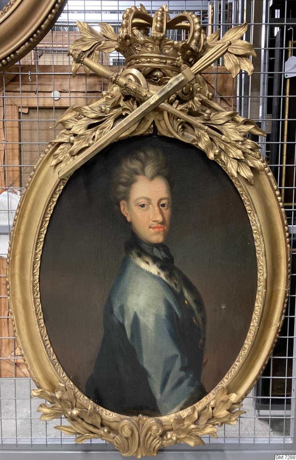 Porträtt av Karl XII, som hängt i Nya Älvsborgs kapell. Porträttets ram av Marcus Jaeger d.y., målning osignerad, konstnär ej känd.