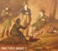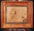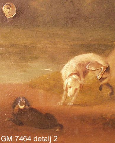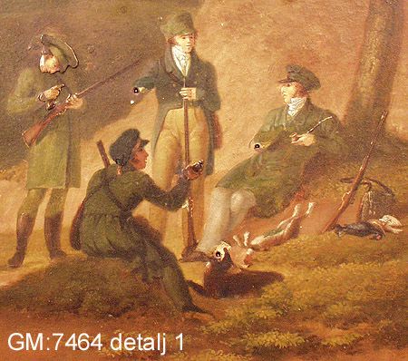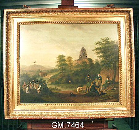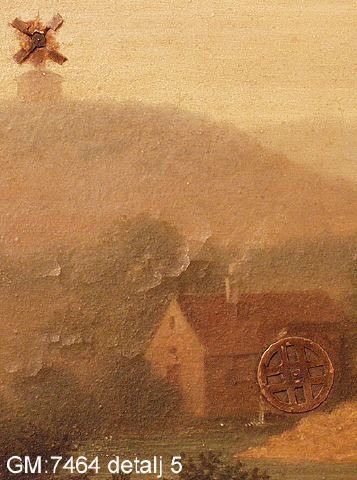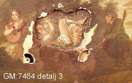• oljemålning på metall med mekaniska, rörliga delar samt urverk. Rörliga delar: huvud och arm på mansperson, ben på hund, kvarnhjul, älskande par. Flera delar förlorade bl.a. klippor eller buskage som dolt det älskande paret.