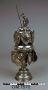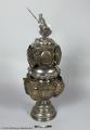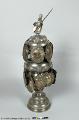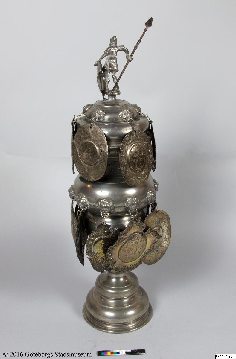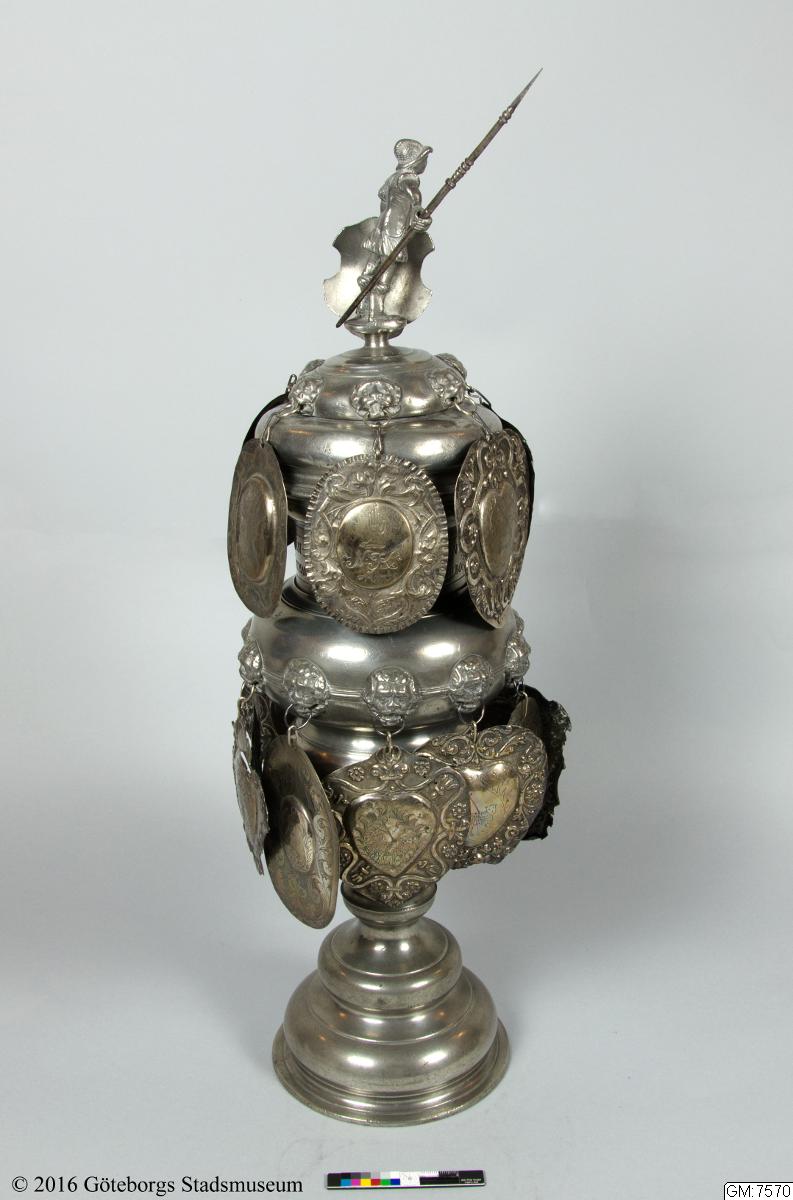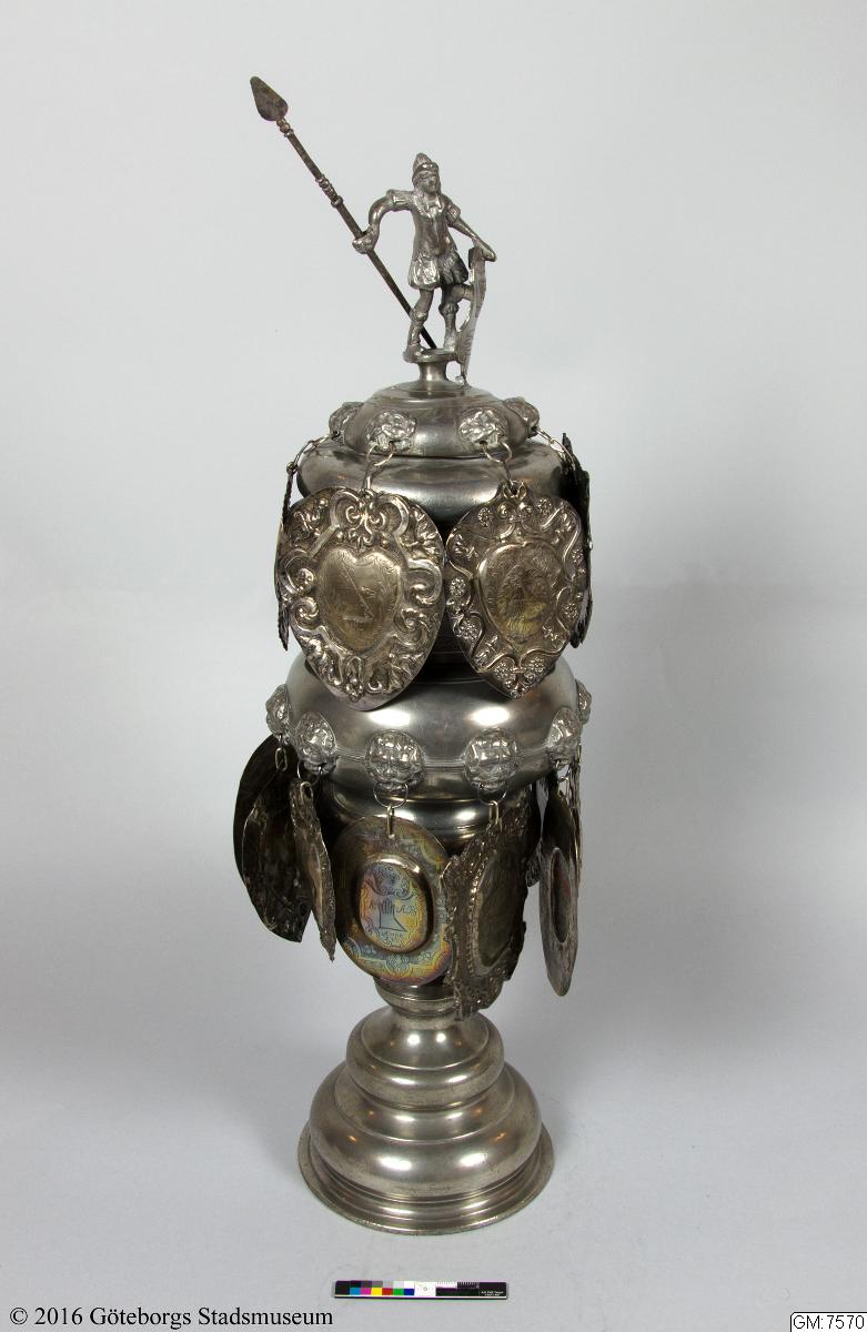 Lock med sköld och fanhållande krönfigur i romersk krigaredräkt. På skölden graverat ett värjgehäng och en handske. Skyltarna, 16 st, hänga dels i en krans på locket dels på kuppan