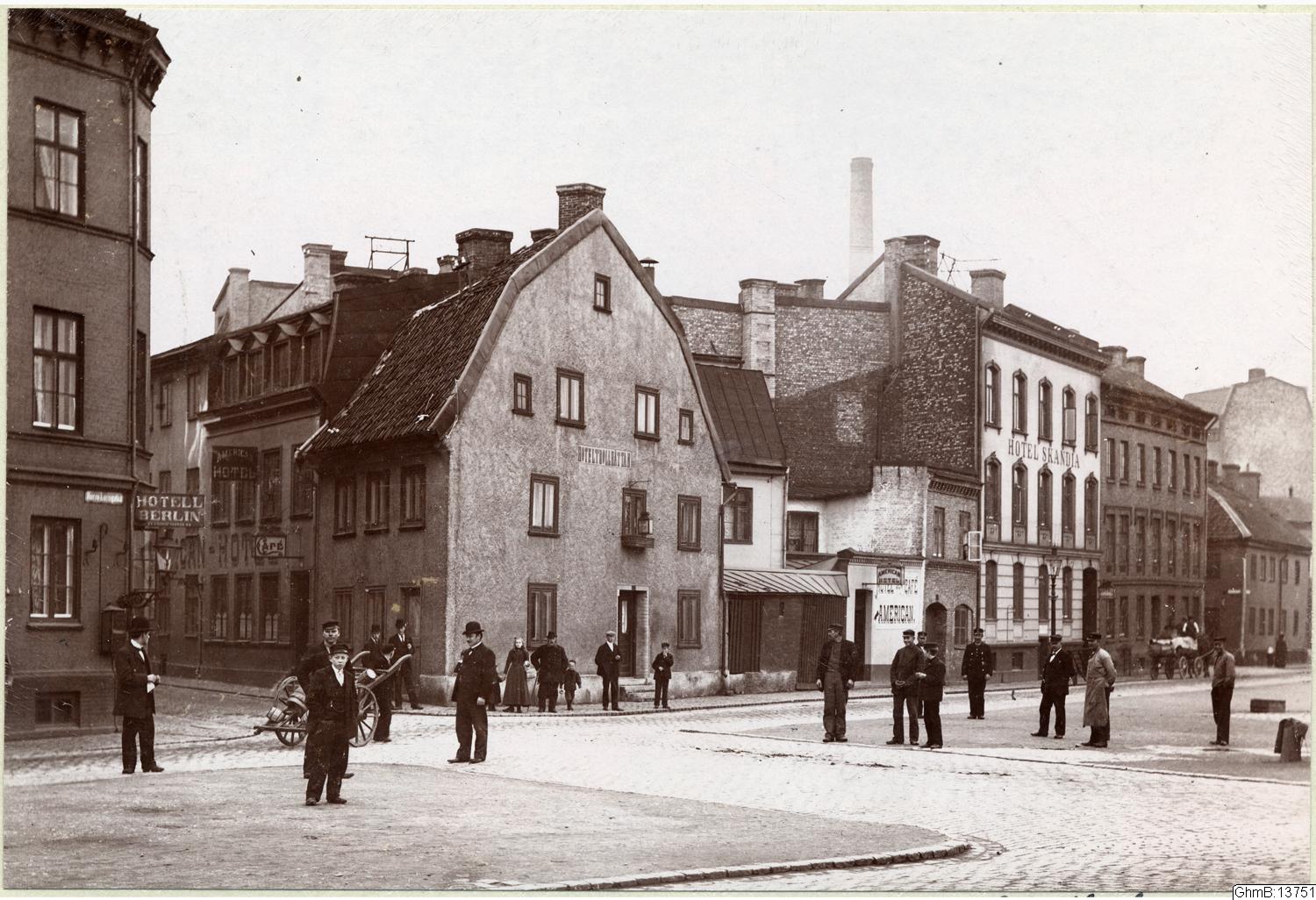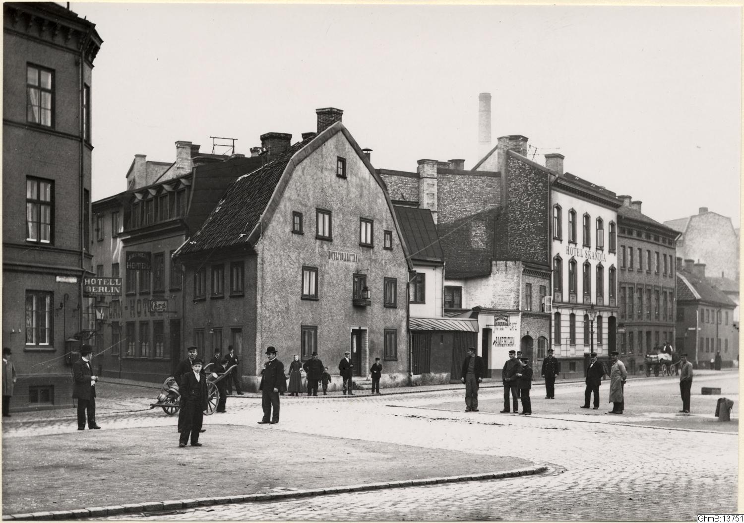 • Norra Larmgatan mot norr med bland annat nr 13, "Strykjärnet". Foto Olga Rinman 1901.