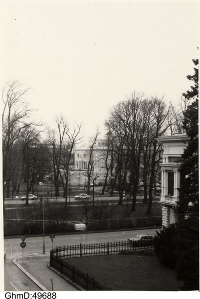 Utsikt från runda rummet i andra våningen, vilken ingick i den lägenhet som grosshandlare Anders Oscar Hertzman och hans familj hyrde 1877-slutet av 1880-talet, vilket hem beskrivs i hans dotter Gurli Hertzman-Ericsons självbiografiska roman. Fönstret mot Allén (1947).