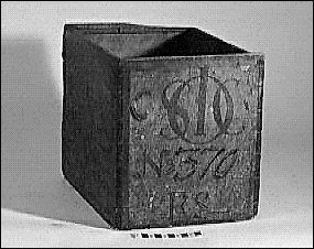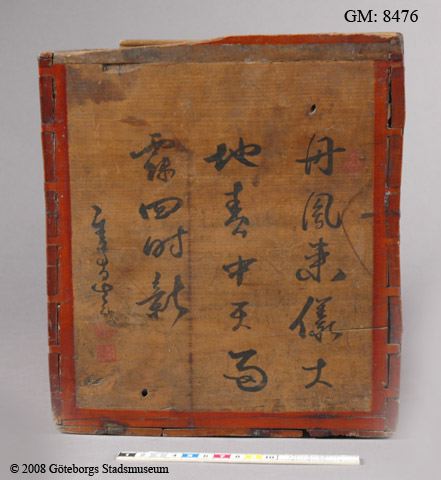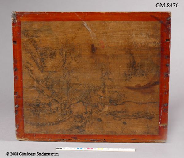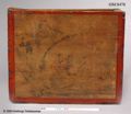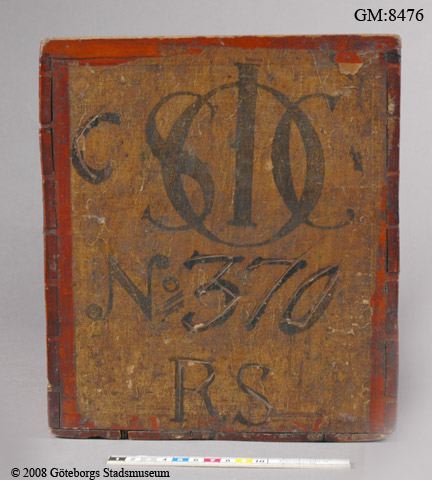 telåda av trä med målad dekor och texter i svart: på ena kortsidan står "SOIC No 370 RS" - Svenska Ost-Indiska Compagniet, låda nr 370, "Riksens Ständer". På motstående sida text med kinesiska bokstäver troligen leverantörens namn. På långsidorna kinesiska landskap. Varje sida inramas av röd bård. Lock saknas.