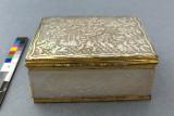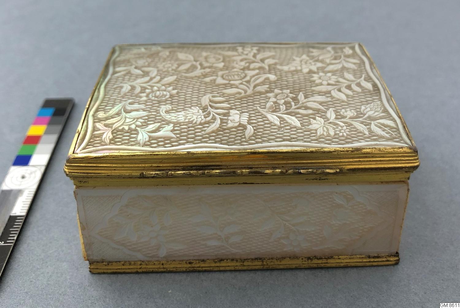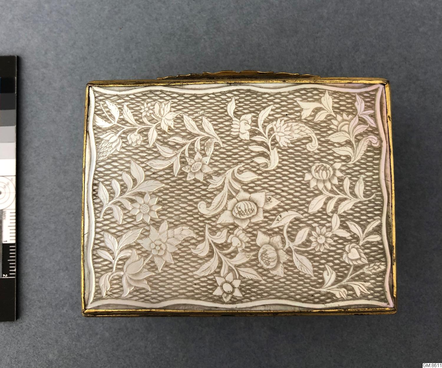 "Snusdosa, pärlemor, monterad med förgyllt silfver. Har tillhört gifvarens farfars svärfar, kommerserådet Carl Gustaf Prytz (1756-1832), Göteborg. Gåfva af grosshandlare Carl R. Prytz, Böö, Göteborg". Det här citatet innehåller felaktigheter/ LarsOlof Lööf 2025. [enl. liggaren]