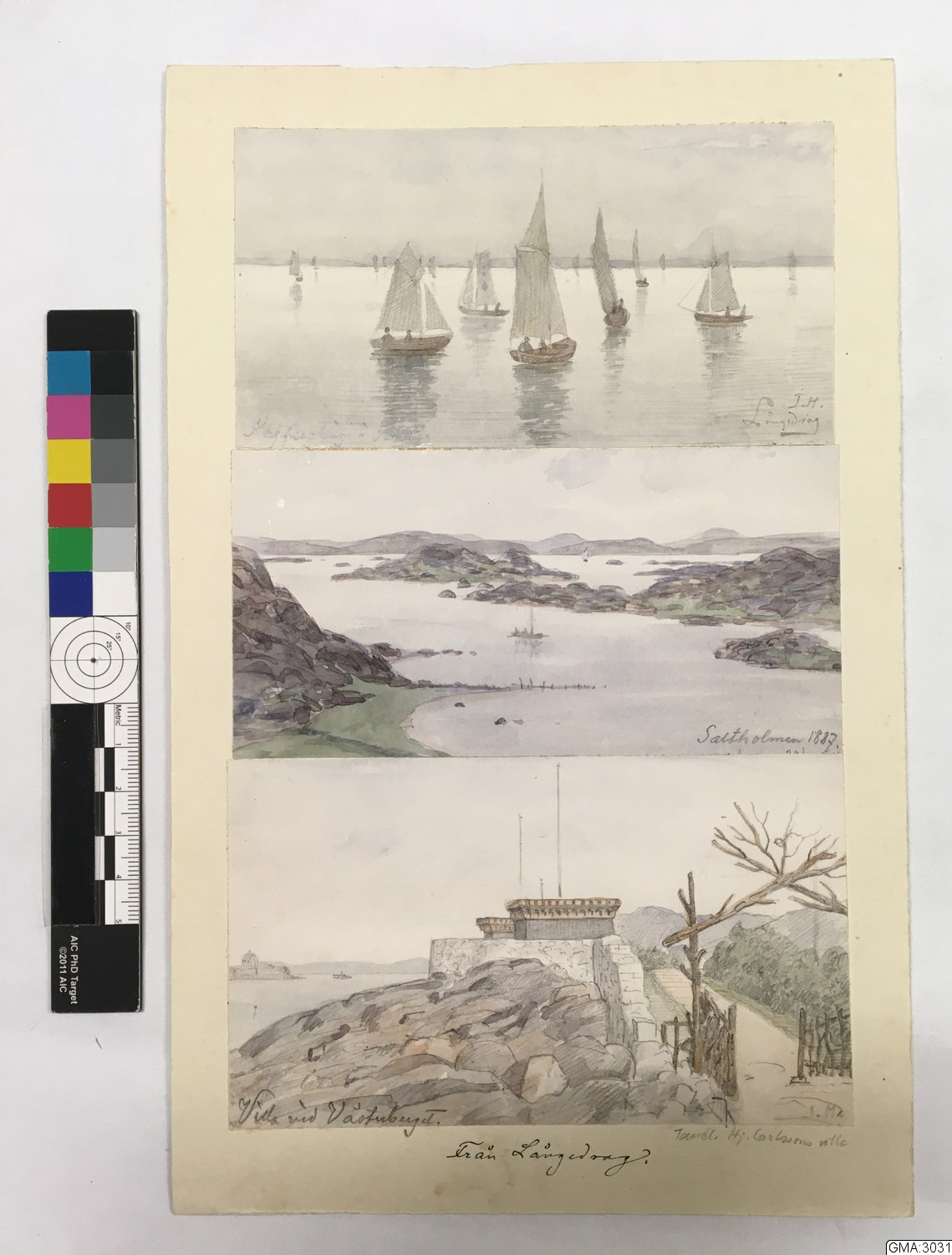 • Från Långedrag, kappsegling i stiltje; akvarell av J. A. Holmquist. Köpt av konstnären. (Se GMA:3011.)