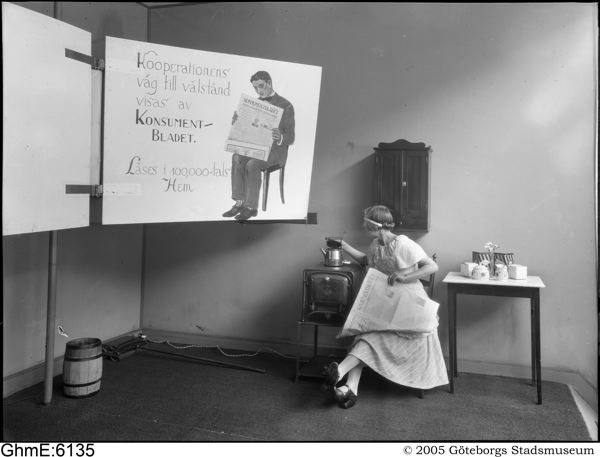 Jubileumsutställningen 1923. Firmautställning: Kooperativa förbundet. Text på skylten: "Kooperationens väg till välstånd visas av Konsumentbladet. Läses i 100,000-tals hem."
