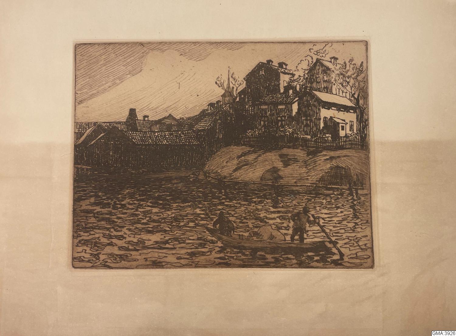 Bebyggelse på "Fyrkanten", etsning. (Av Otto Malmström.) Jfr teckning av O. Malmström med samma motiv, repr. i "Våren", 1907. Neg. D. 9511. (U:103, D.9512.)
