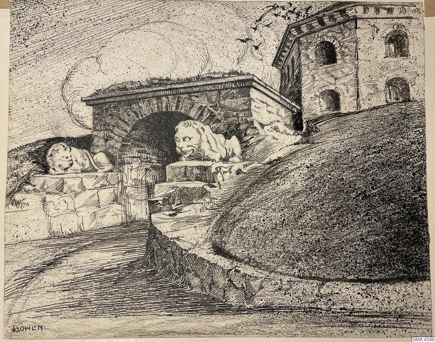• Skansen Kronan-motiv. Teckning i tusch och blyerts av Nils Bohlin. (D.9941.) (För ytterligare upplysning, se GMA:4096, under Beskrivning.)