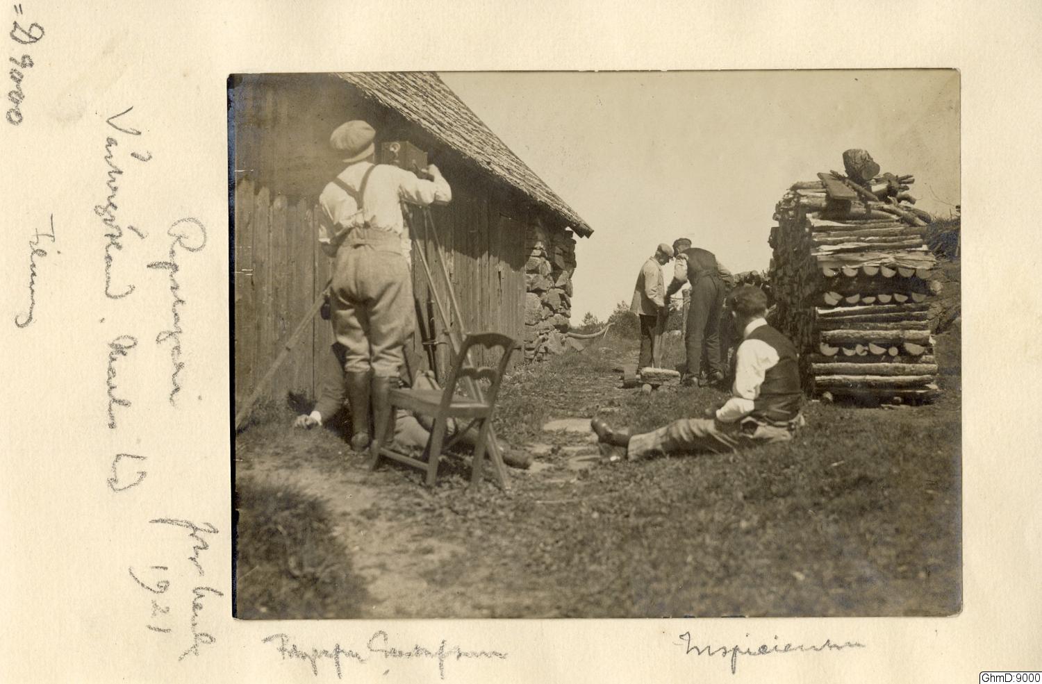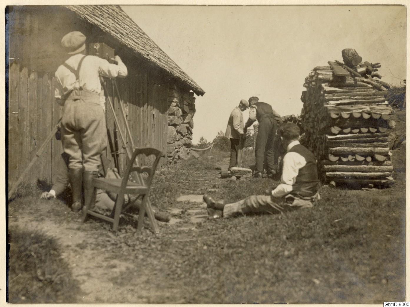 • Filmning av enklare repslageri i Hyssna. I förgrunden från vänster: filmfotografen John Gustafsson och , till höger om honom sittande på marken, inspicienten. Gustafssons kamera är riktad mot två gest... Visa hela