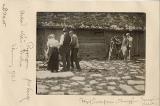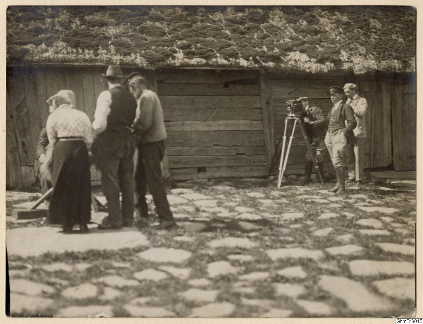 • Filmning av repslageri 1921 i Backa i Värö sn, Halland. Figurgrupp till vänster repslagande bybor. Figurgrupp till höger, filmexpeditionen, bestående av (från vänster): fotograf Gustafsson, chauffören... Visa hela