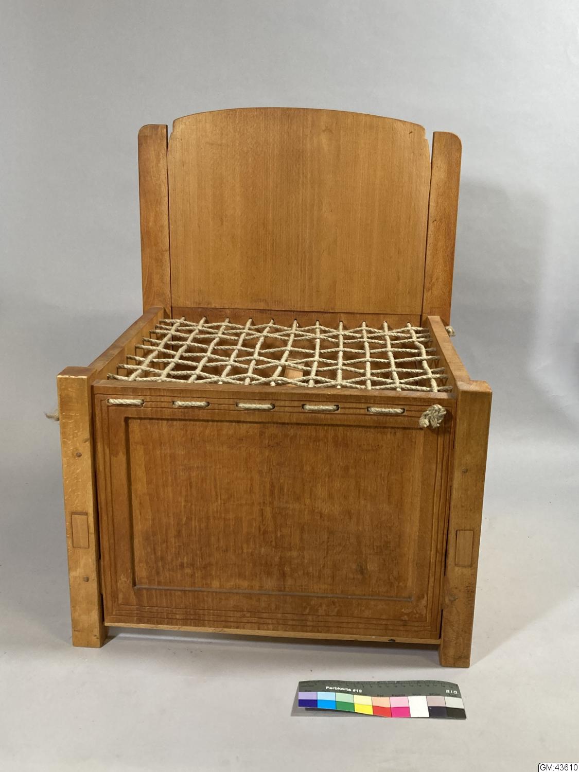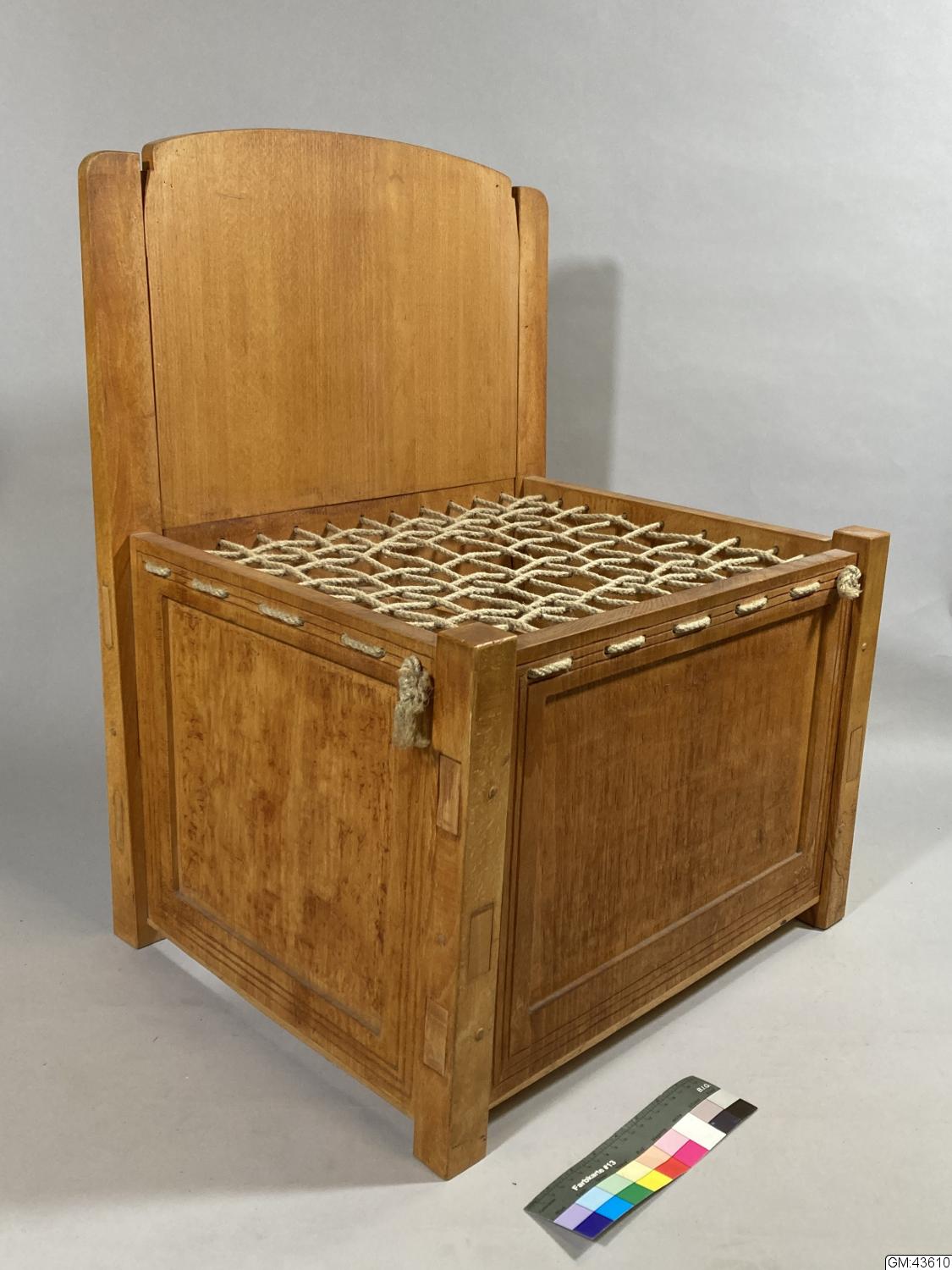 • Sannolikt hemsnickrad sittmöbel för barn (trol.) utförd i bok med en flätad sits av rep.