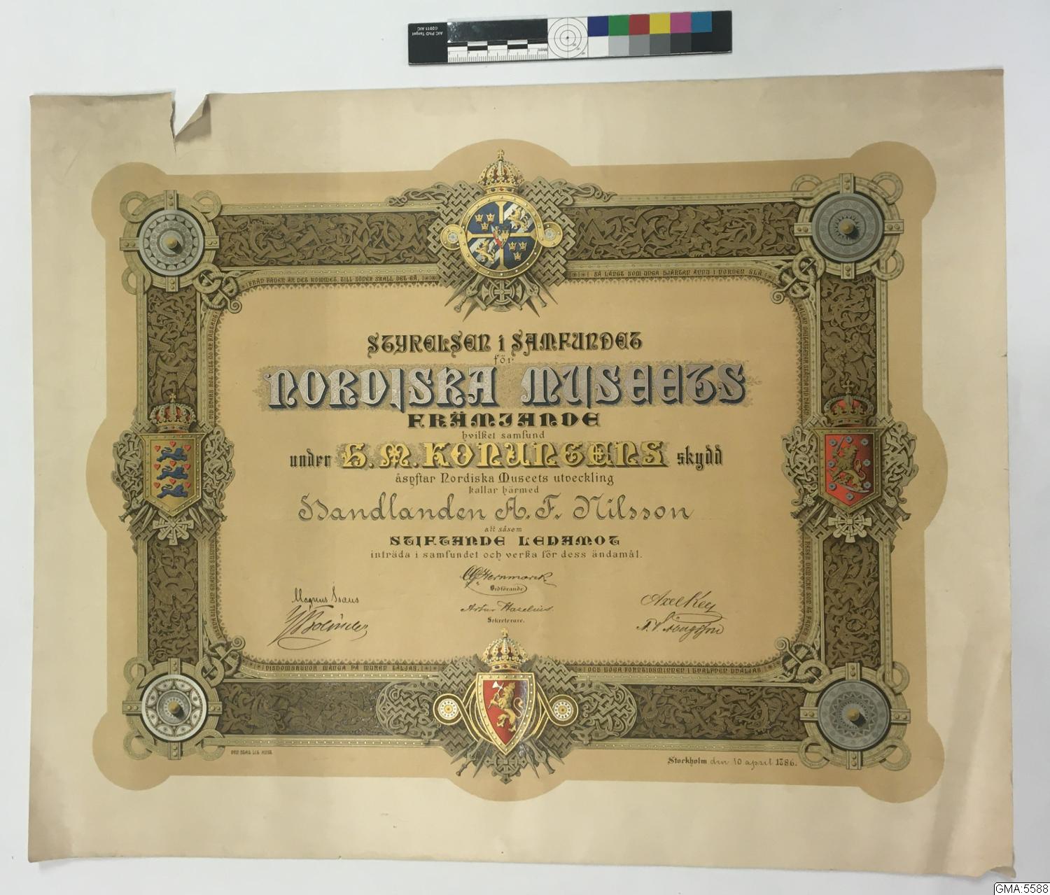• Program vid Operamaskeraden å Stora Teatern, Göteborg, den 5 mars 1887, samt kallelse år 1886 av handlanden A. F. Nilsson till ledamot i Samfundet för Nordiska Museets främjande.