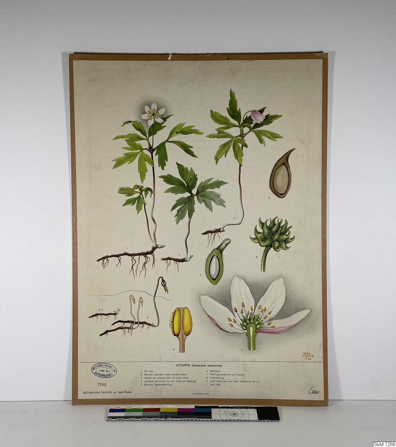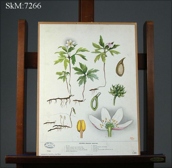 Vitsippa (Anemone nemorosa). 1. Hel växt. 2. Blomlöst exemplar med utvecklat blad. 3. Västen om aftonen eller vid mulet väder. 4. Jordstam på vintern (a) och tidigt på våren (b). 5. Blomma i genomskärning. 6. Ståndare. 7. Pistill genomskuren på längden. 8. Fruktställning. 9. Frukt (nöt), den ena sidan bortskuren för att visa fröet.