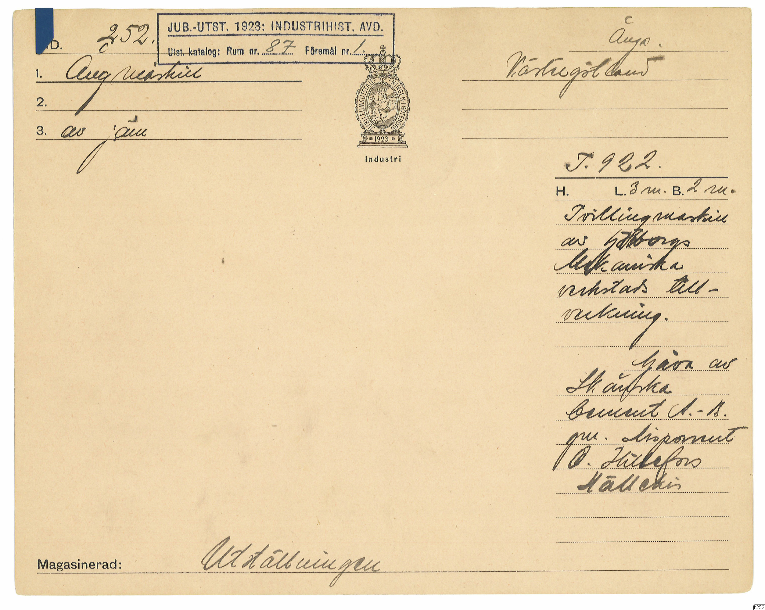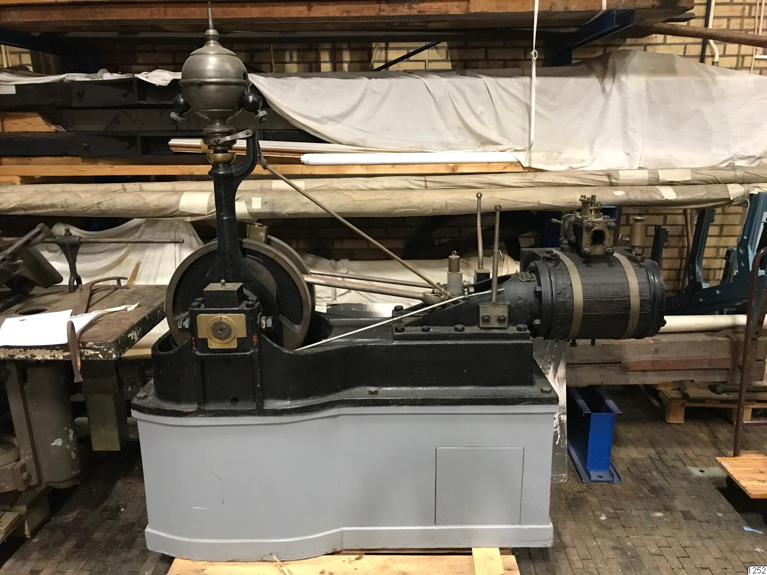 1886 gjorde Keillers verkstad tre tvillingångmaskiner för elcentralen i Jönköping. Detta är en av dem. Objektet var utställt på Jubileumsutställningen 1923, i rum nr 87, föremål nr 1, och det var, enligt katalogkortet i pärmen, en gåva av Skånska Cement AB genom disponent O. Hillfors, Hällekis.