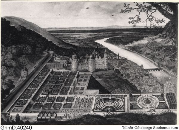 Jämförelsebild. "200. Ansicht des "Hortus Palatinus" am Heidelberger Schloss mit Ausblick auf Stadt und Neckarlandschaft, Gemälde von Jacques Fouquiéres, um 1618. Heidelberg, Kurpfälzisches Museum."