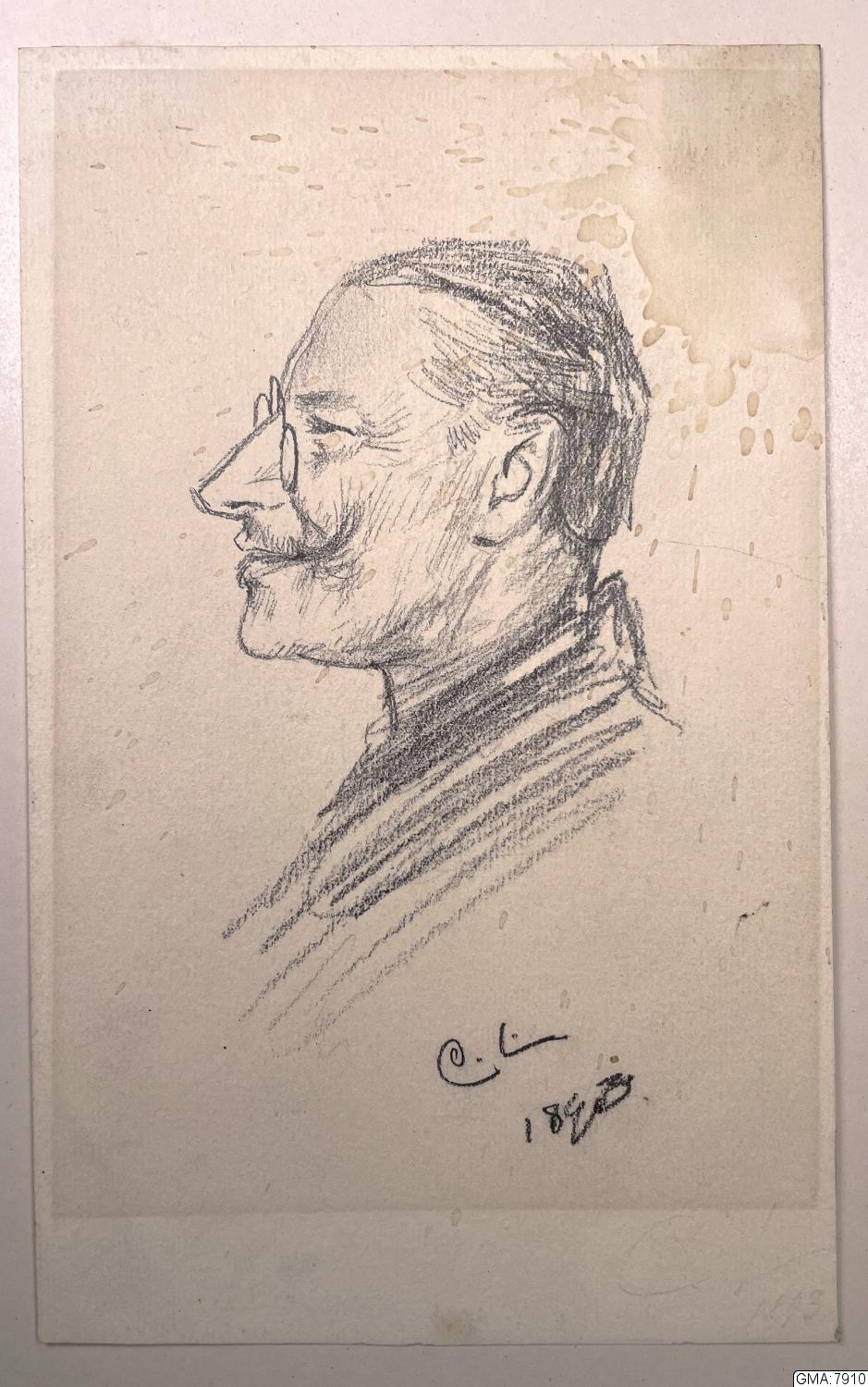 • blyertsteckning, porträtt av handels- och politiborgmästaren, fil. dr Gustaf Svanberg, Göteborg (1839-1909). Signerad C. L. (= Carl Larsson) 1893. 22,3 x 13,8 cm.