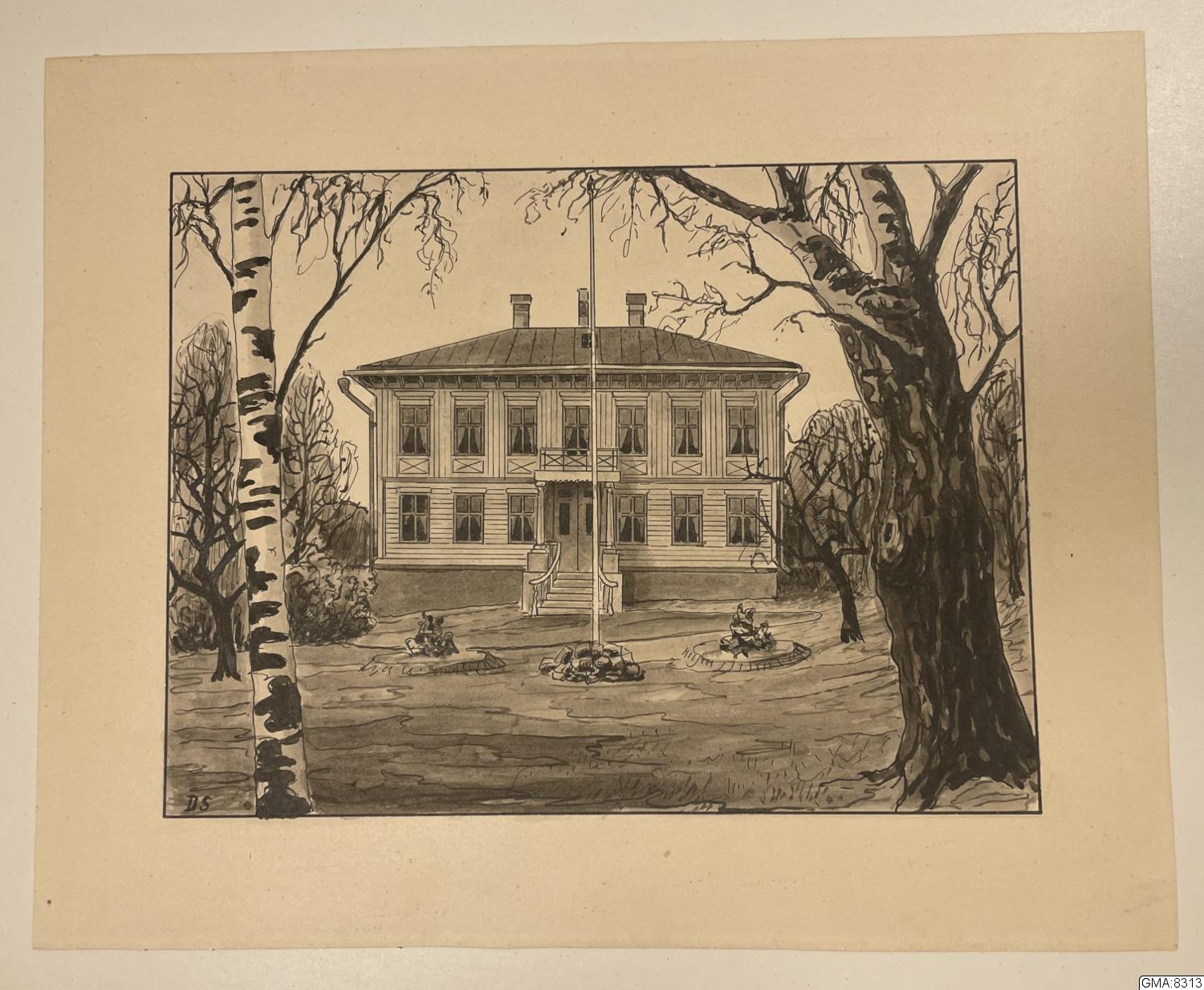 • laverad tuschteckning (tuschlavyr), signerad D. S. (Strid): Gibraltar herrgård, exteriör. 16,5 x 22 cm.