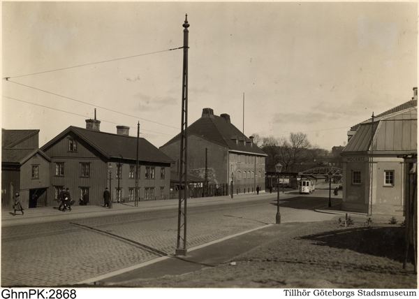 Gullbergsbrogatan med Renströmska Badanstalten och viadukten. T.v. (trähusen) Stadens 12 rote, nr 20A = Gullbergsbrogatan 78. Detta höga husnummer vid den i och för sig tämligen korta Gullbergsbrogatan förklaras av att Stampgatan tidigare gick ända fram till Gullbergsbro och att man vid namnförändringen av Stampgatans östligaste del (till Gullbegsbrogatan) lät husen därstädes behålla sina gamla nummerbeteckningar