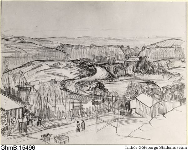 • Vy från Norra Guldhedsområdet vid tiden för uppbyggandet av modernare hus hus på området. Blyertsteckning, 33 x 40,5 cm, sign. O.G. (Olaf Gottowt-Gesang) Norra Guldheden 1946. Jfr karta Fotou.nr:0:2653 där teckningens vy är markerad med två pilar.