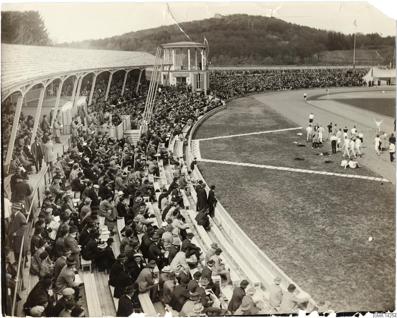 • Friidrottstävling på Slottskogsvallen 1930, målgång av löpgren.