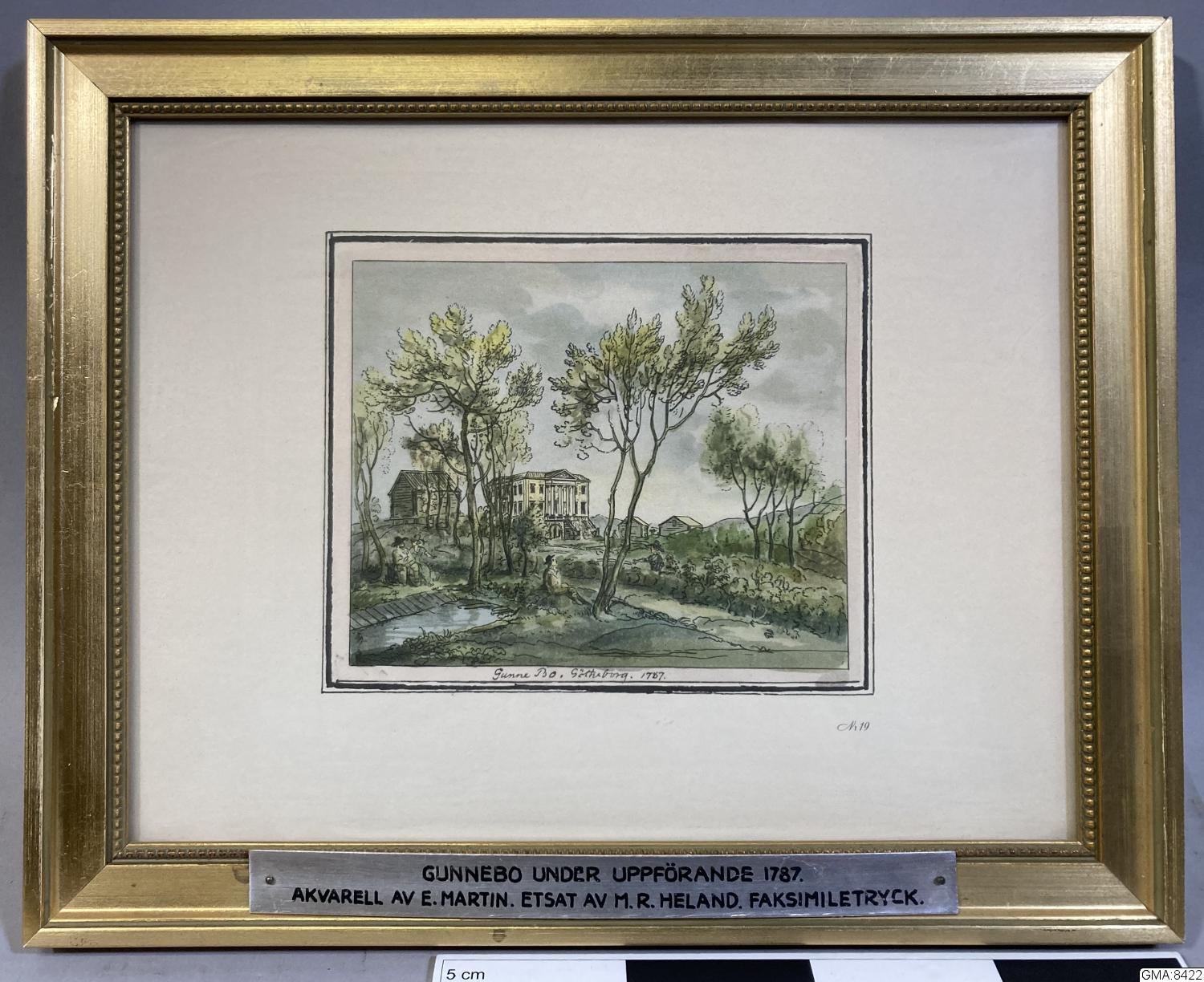 • "Gunnebo. Götheborg 1787." Faksimiletryck ur "Gustavianska bilder. Ett album av bröderna Martin. Med inledning av Gösta Selling." (Stockholm 1954.) (Akvarell av E. Martin. Etsat av M. R. Heland.) Originalet i privat ägo. (Med.dr. Gustaf Brun, Gävle.)