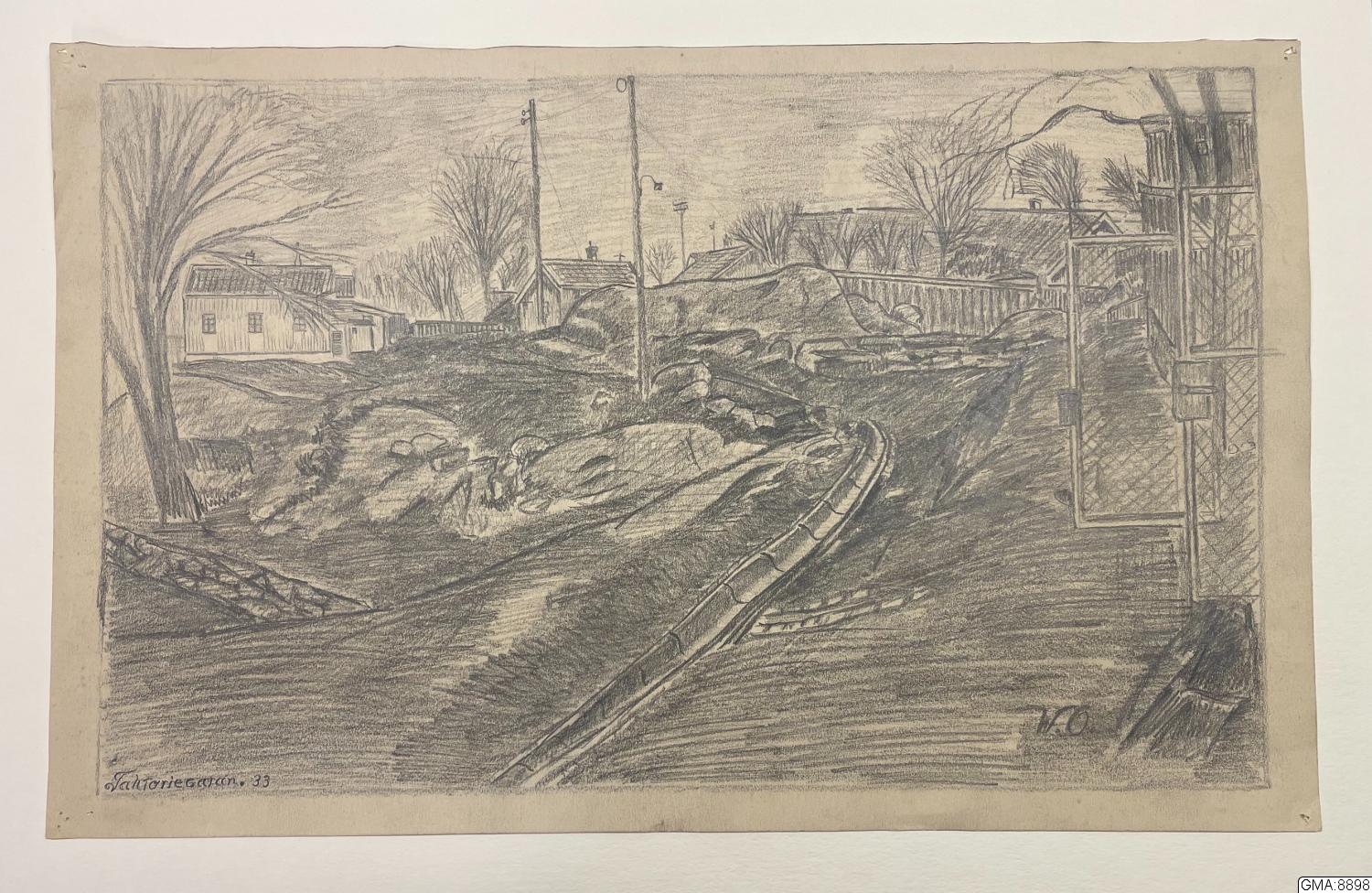 • blyertsteckning av Willgodt Olsson 1933: Faktorigatan (Majberget), uppgång från Gröna Gatan.