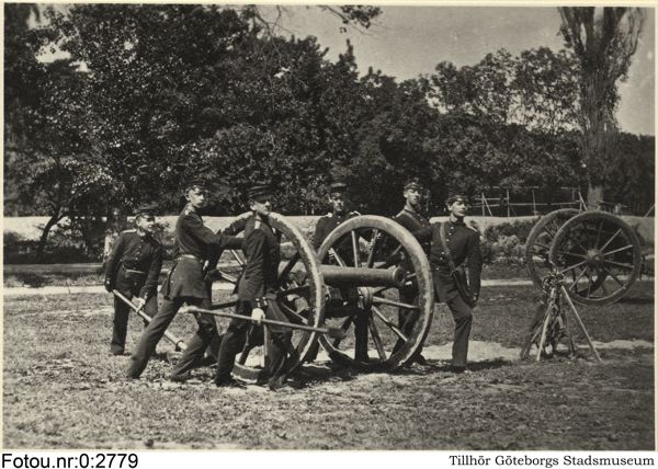 Göta artilleriregemente. Exercis på Heden i Göteborg. Sigfrid Jacobsson, nr 2 från vänster.Charles Möller, nr 3 från vänster.
