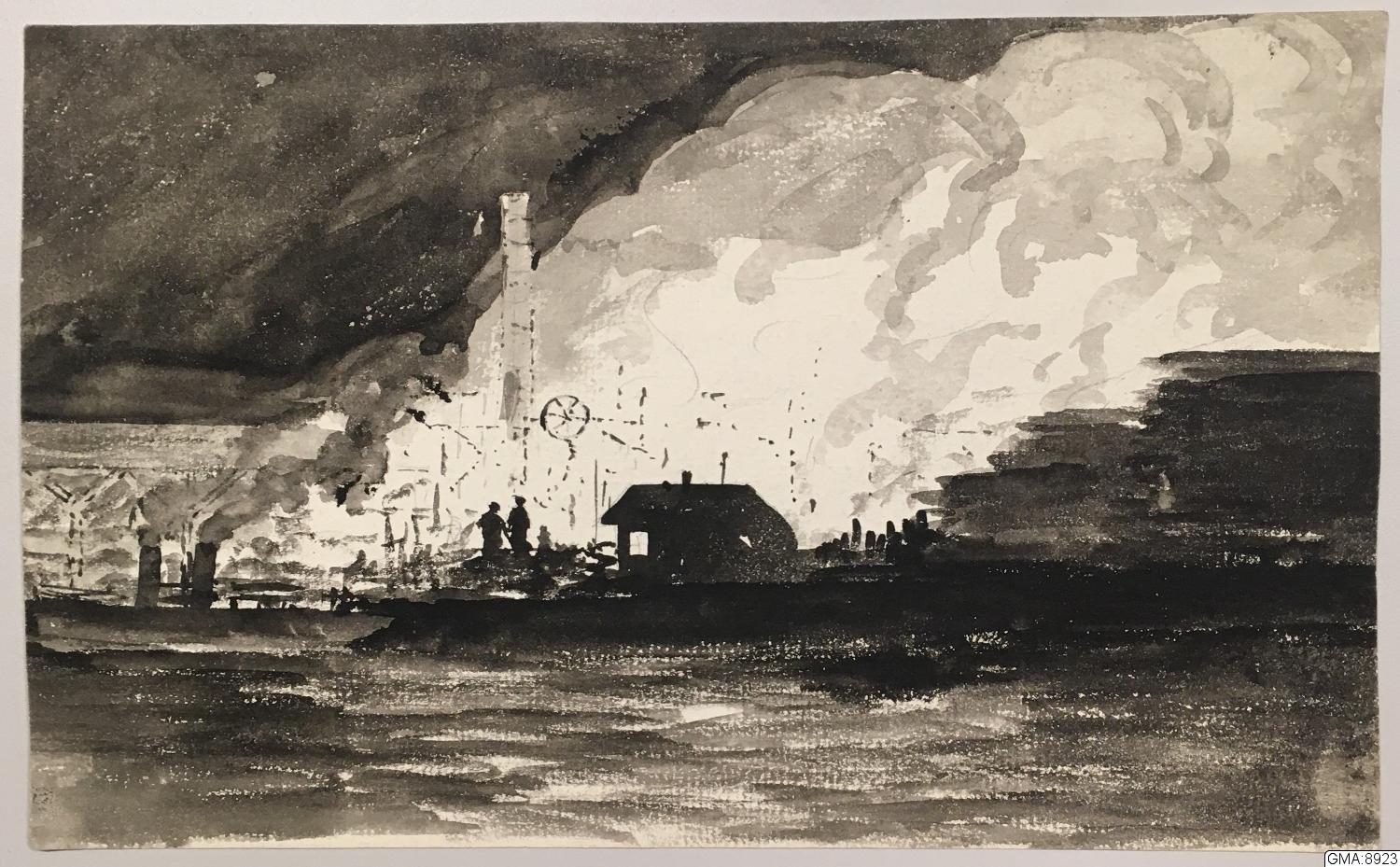 a) laverad tuschteckning från branden i Strömmer & Larssons virkesupplag på Hisingen 18/7 1925, kvällsmotiv;