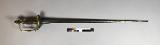• officersvärja. Etsad klinga, ej ursprunglig spets. Balja av trä, klädd med skinn