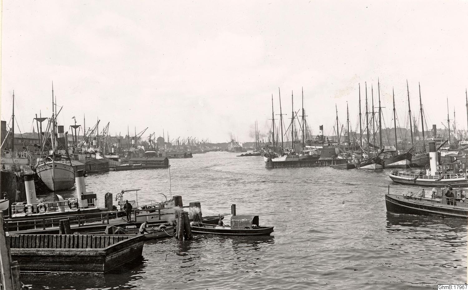 • Hamnen med blick västerut från Masthuggskajen. Till vänster Masthuggskajen och till höger syns Lyndholmen.