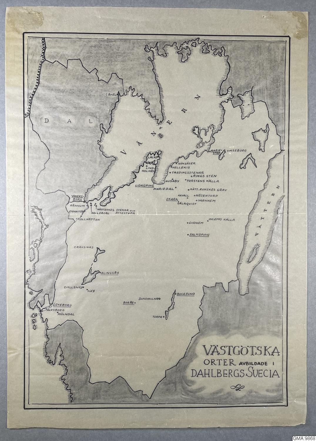 • "Västgötska orter avbildade i Dahlbergs Suecia", karta upprättad av docent Harald Wideen. Tusch och blyerts på kalkerpapper.
