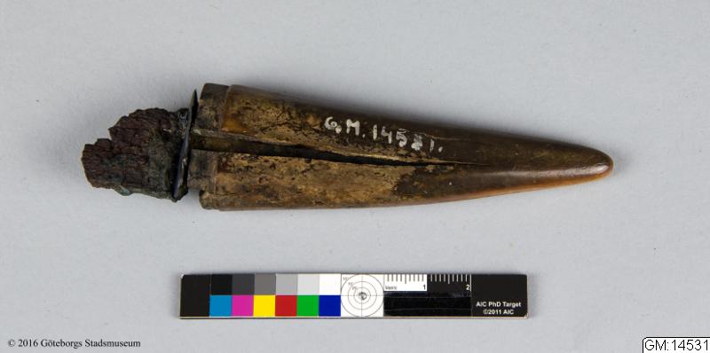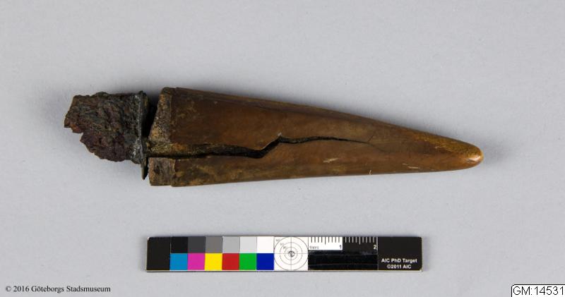Hittad 1934 i Ale, Sankt Peder, Lilla Edet, Västergötland, Sverige.