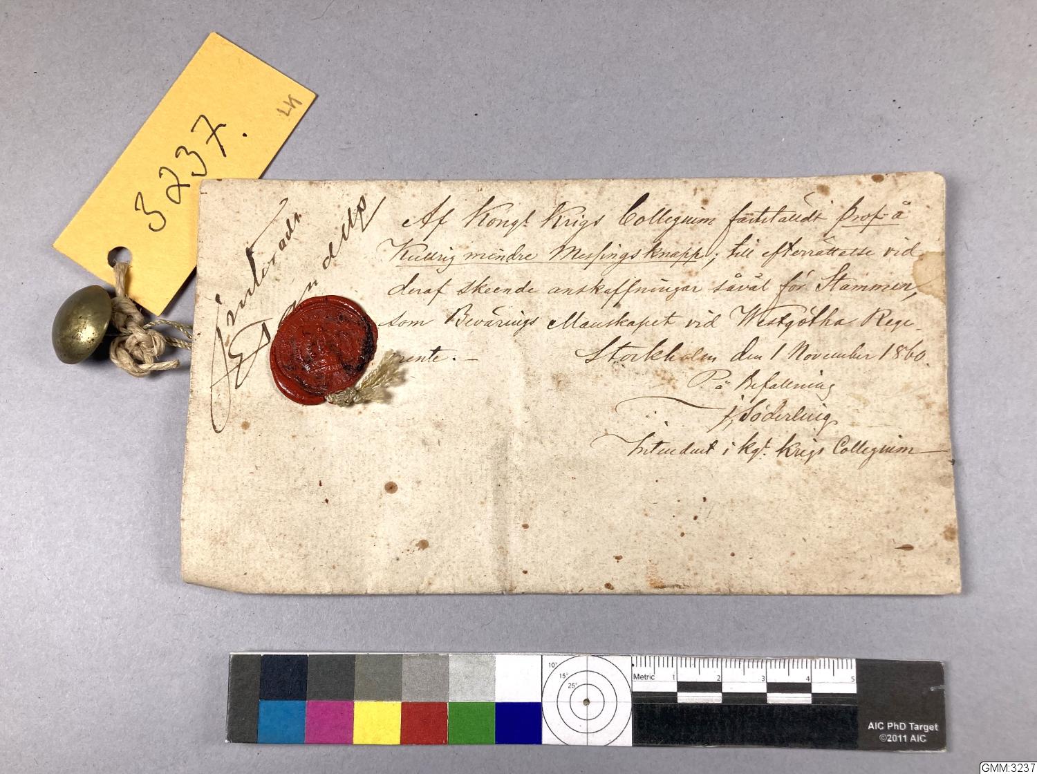 Modell på knapp, Av Kongl. Krigs Collegium fastställd prof å kullrig mindre mässingsknapp, till efterrättelse vid därav skeende anskaffningar såväl för stammen som Beväringsmanskapet vid Westgötha Regemente. Stockholm den 1 november 1860. På befallning, J. Söderling Intendent i Kungl. Krigs Collegium.