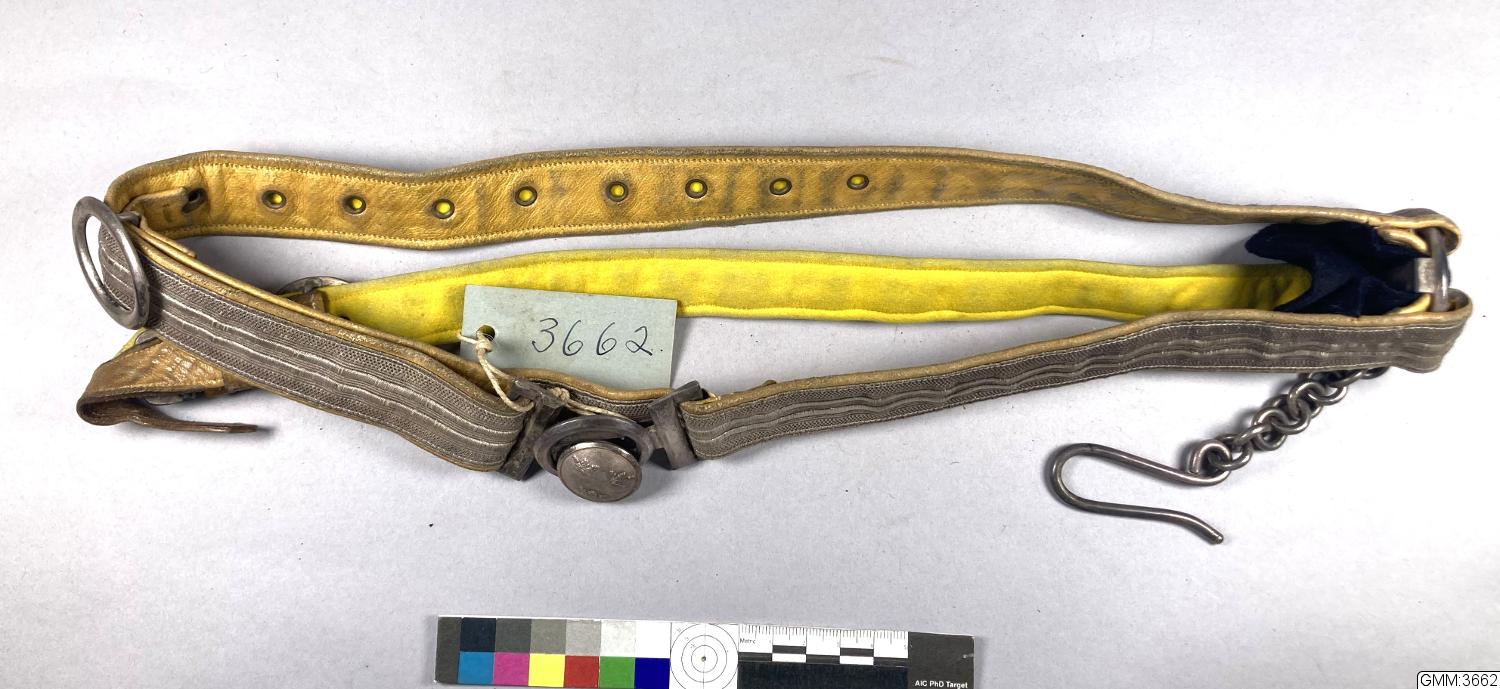 • Sabelkoppel med en koppelrem. Ändringsmodell 1899 från m/1859 för officer vid Svea Livgarde. Silver och gult kläde och silverbeslag.
