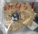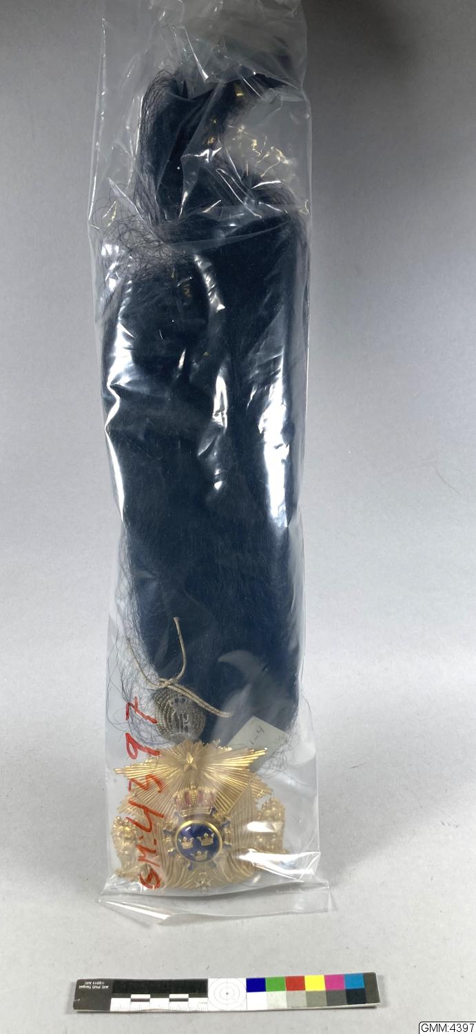 • med pompom, plym och mössknapp för officer vid infanteriet.