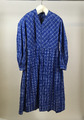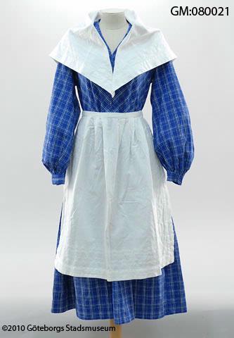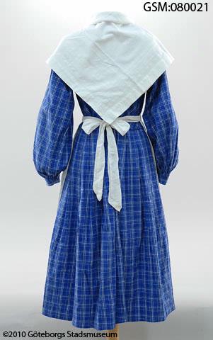 husmodersdräkt bestående av klänning av mönstervävt bomullstyg, förkläde och halskläde av glesväv vit bomull (eller bomullsblandning)med invävda randbårder i vitt. Sannolikt har också en huvudbonad liknande en bindmössa, hört till dräkten men det är inte säkert om mössan som syddes till denna dräkt är bevarad eller ej och vilken av de bevarade mössorna GSM:080027-GSM:080030 som i så fall hör till ...