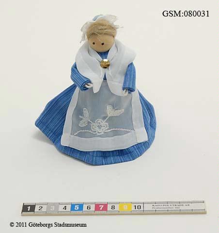 prydnadsfigur som föreställer en kvinna i husmodersdräkt. blårandig bomullsklänning, vitt förkläde och halskläde med broderier samt broderad mössa av ljusblå satäng med stycke. själva figuren har en träkula till huvud med linblånor som hår. Armarna är av karkas och under kjolen vilar figuren på veckat och hoprullat stelt tyg.