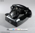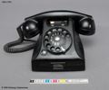 • Svart bordstelefon med televerkets stämpel under. Det finns även en metalletikett under telefonen där det står: 00-29566 Shema 00-22-22-3 30 1967 s