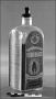 Glasflaska med ärgad skruvkork av metall, pappersetikett som täcker tre sidor, rött vitt och gult. Med "Fabriksmärke" en björn med mortel och stora riksvapnet. Text på sidorna bruksanvisning och prisbelöningar.