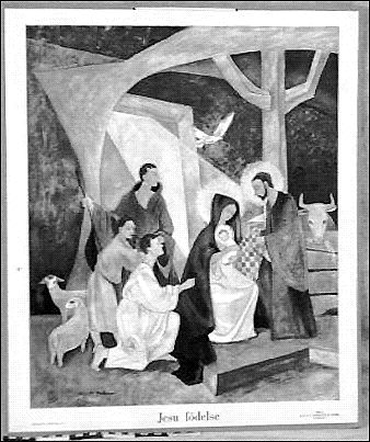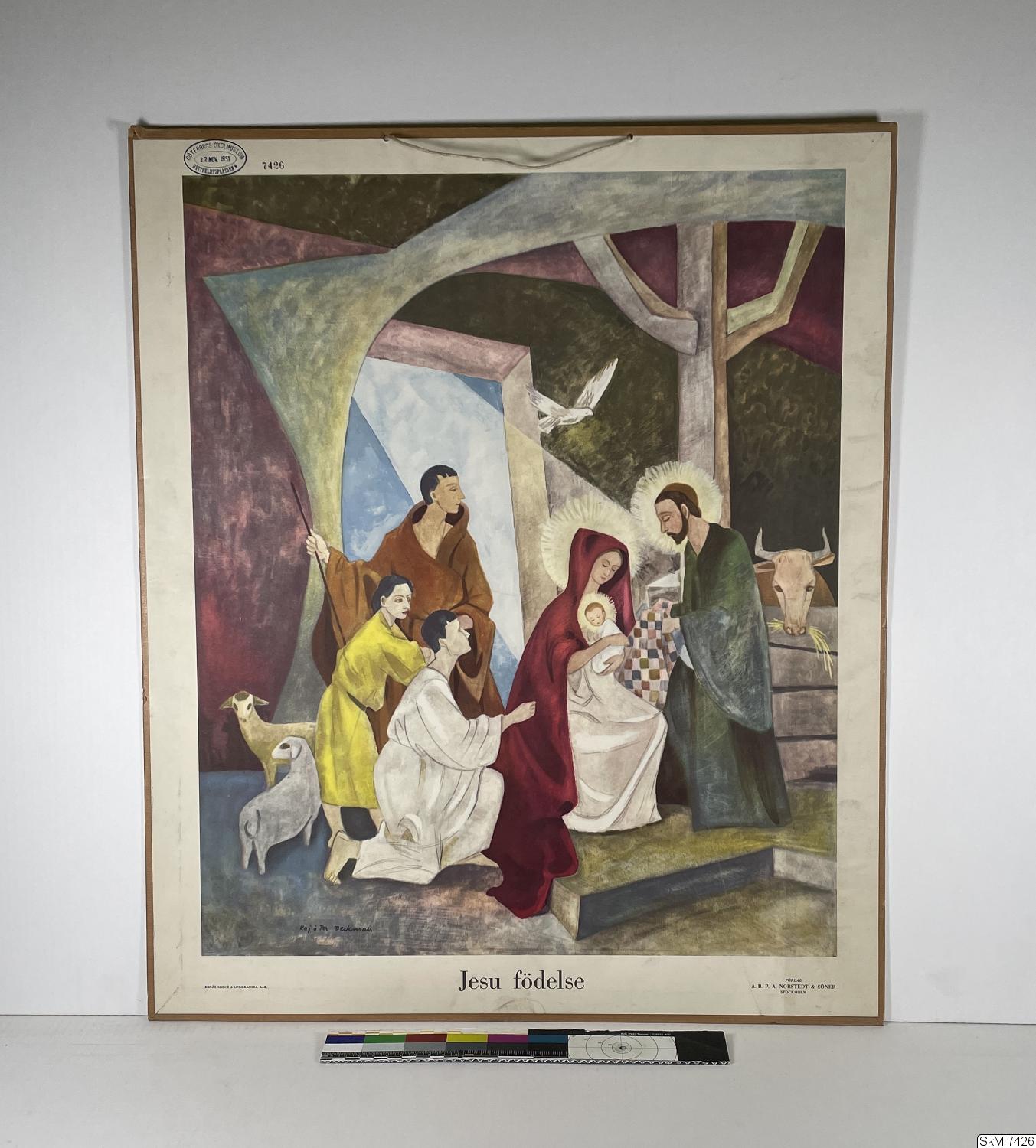 Material: papper papp#Teknik: tryckt limmat#Motiv: "Jesu födelse", polykrom bild.#Serie: Bilder till Nya Testamentet#Bilden gjord av Kaj och Per Beckman#